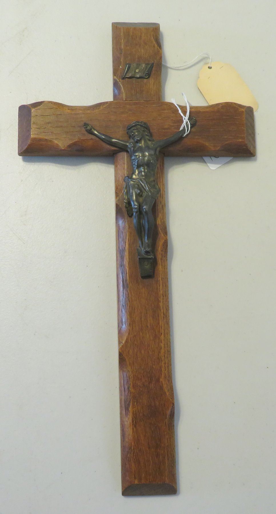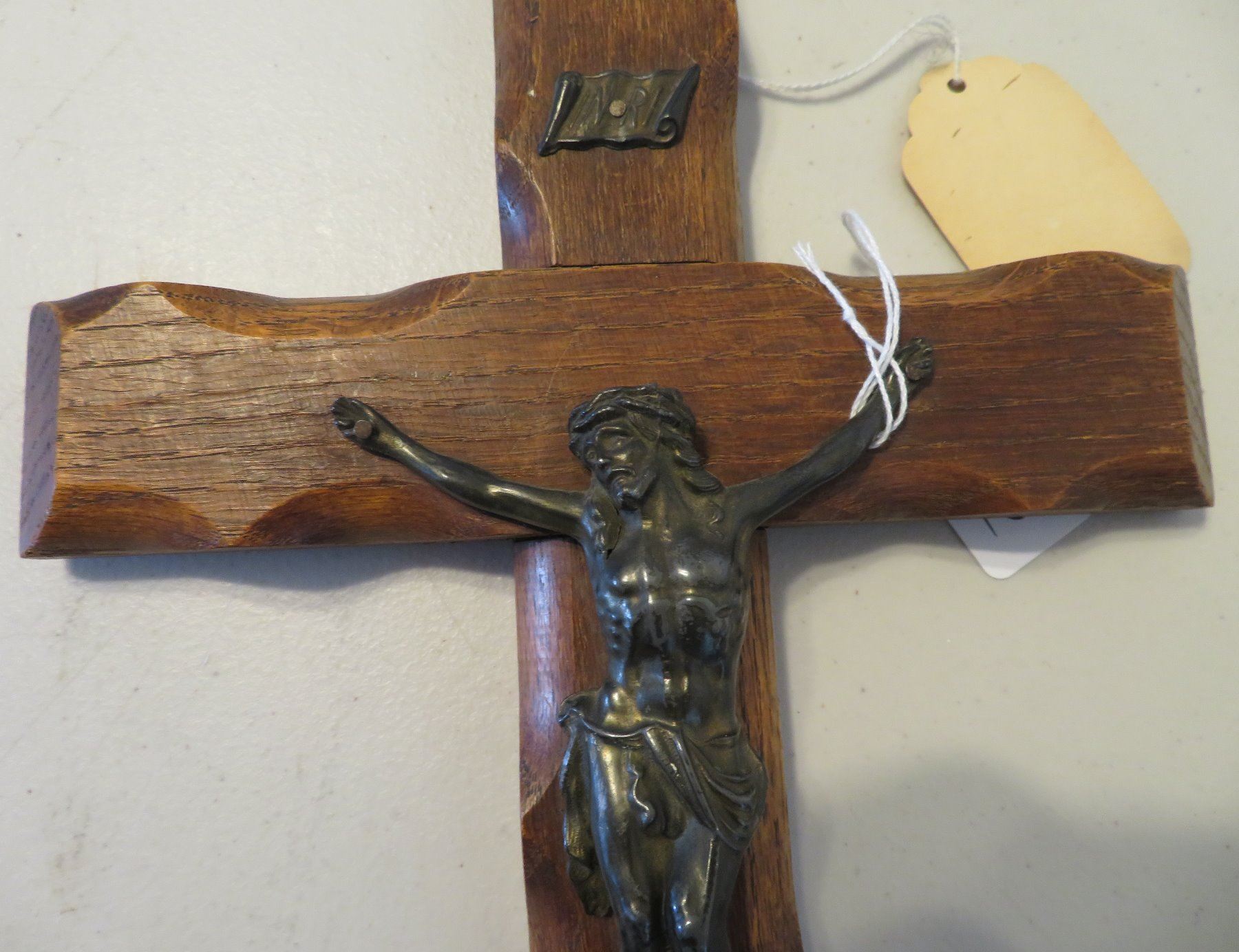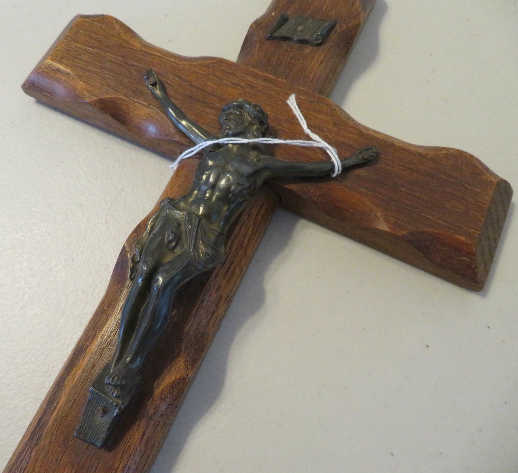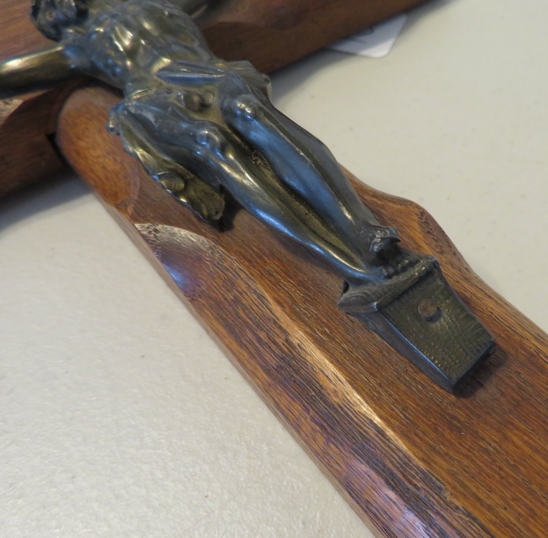 Antique Religious Crucifix, c. 1940s. Made of wood and bronze, the item measures 9 1/4" x 17 3/4" x 1 3/4". Mexico. INRI plaque: Iesvs Nazareavs Rex Ivdaeorum, Jesus of Nazarath, the King of the Jews. Condition: Good, nice patina, crack on shoulder, see images. Shipping: $30.00 w/insurance and signature, due to length and weight.