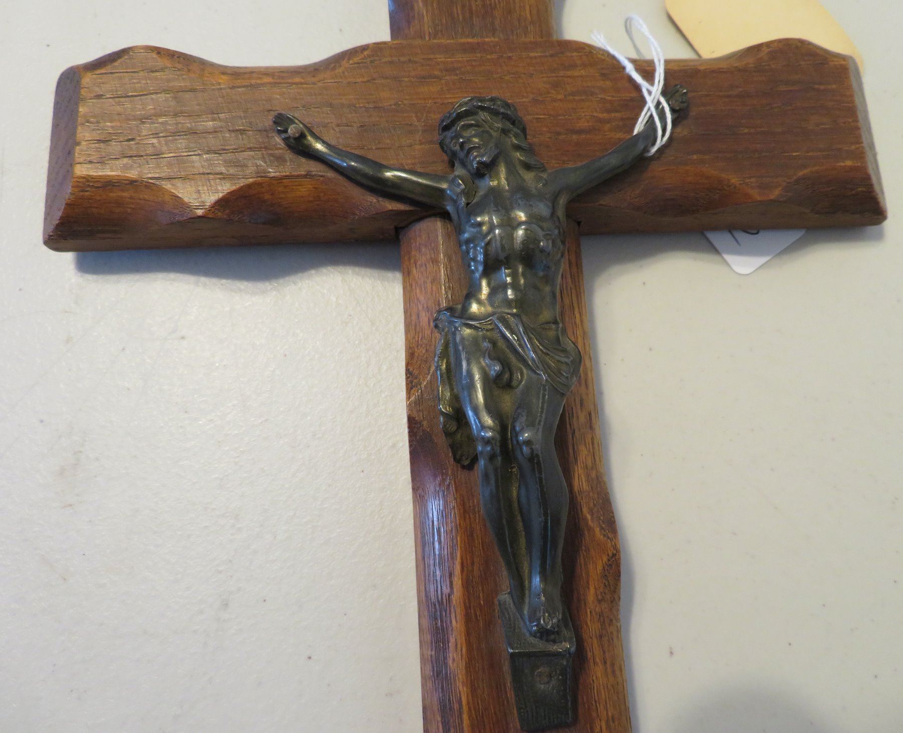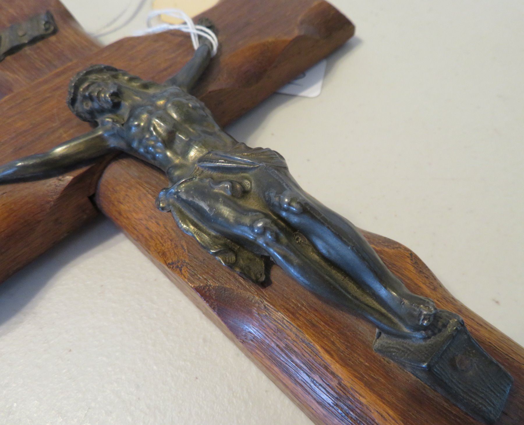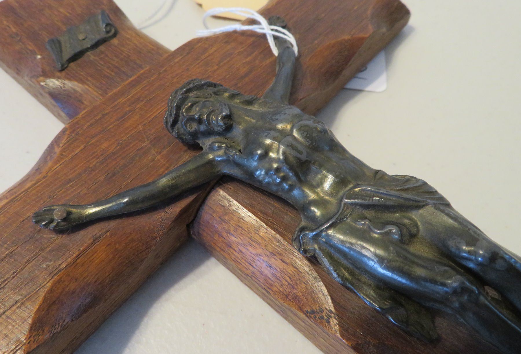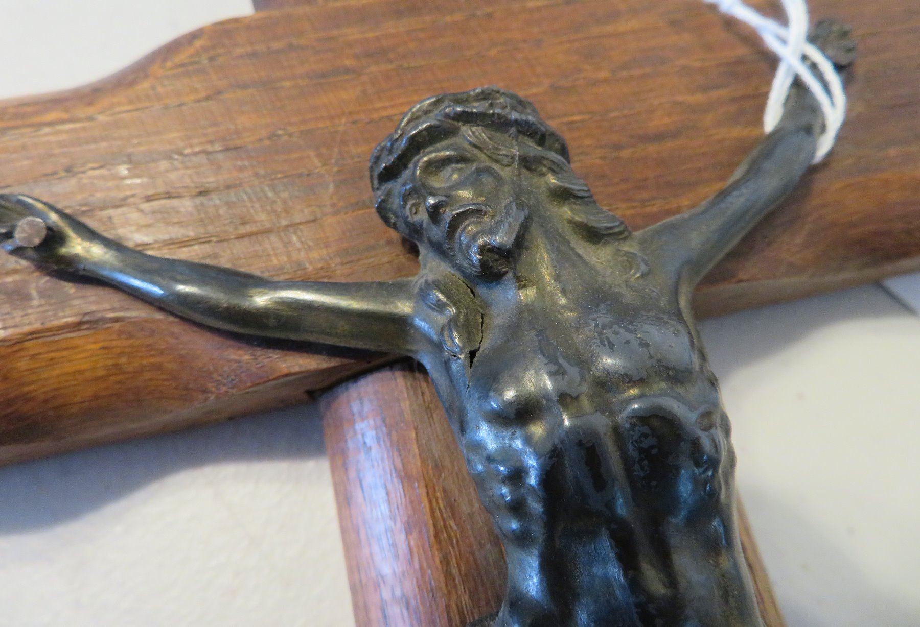 Antique Religious Crucifix, c. 1940s. Made of wood and bronze, the item measures 9 1/4" x 17 3/4" x 1 3/4". Mexico. INRI plaque: Iesvs Nazareavs Rex Ivdaeorum, Jesus of Nazarath, the King of the Jews. Condition: Good, nice patina, crack on shoulder, see images. Shipping: $30.00 w/insurance and signature, due to length and weight.