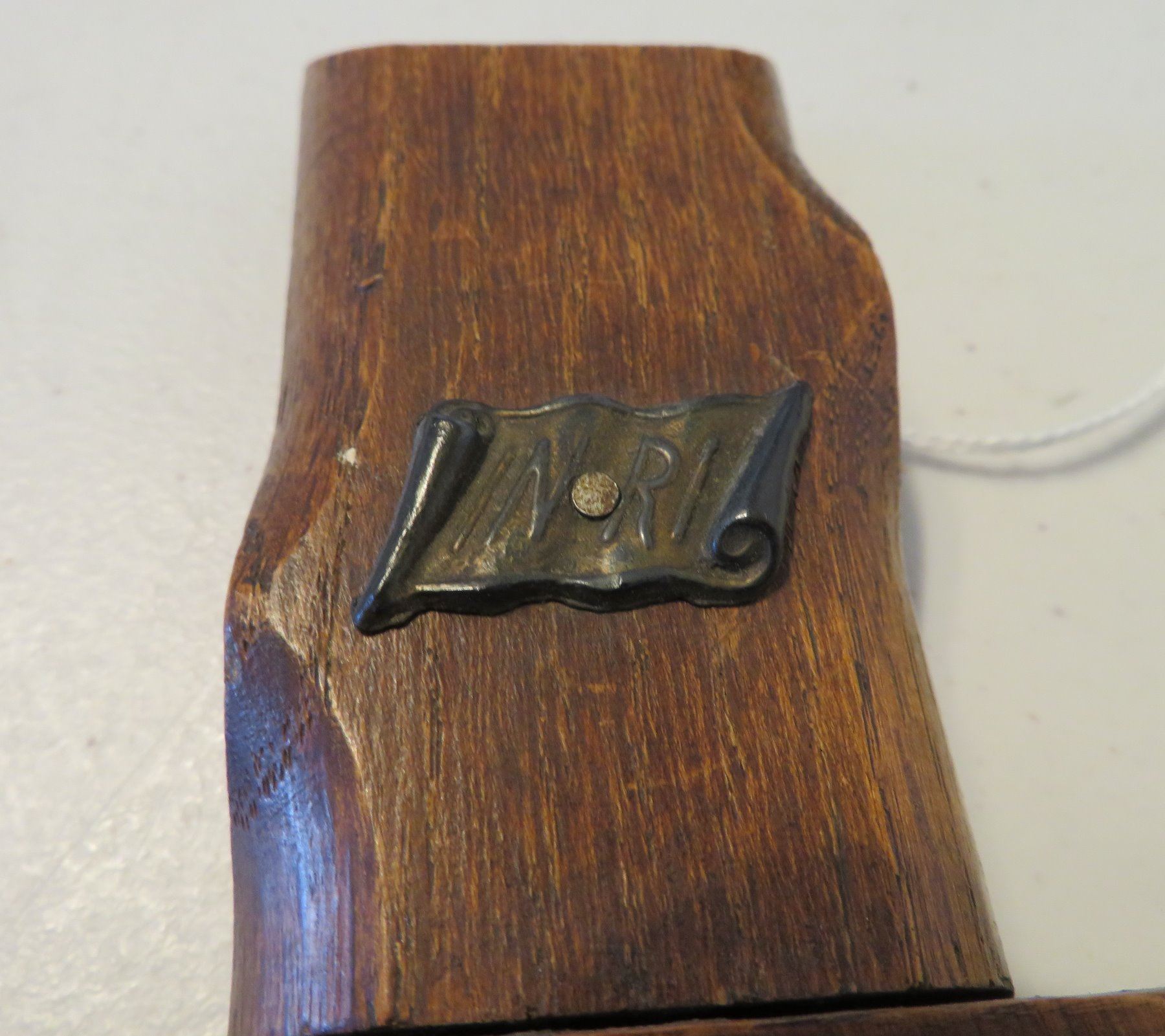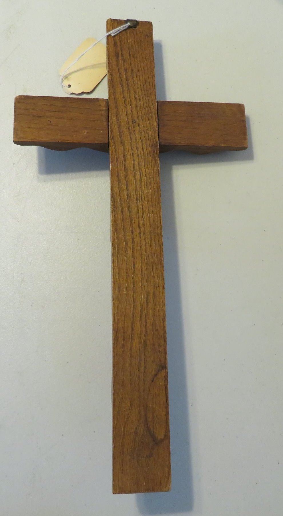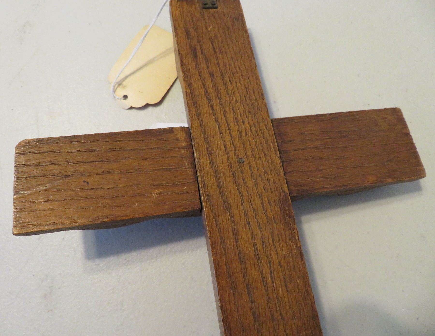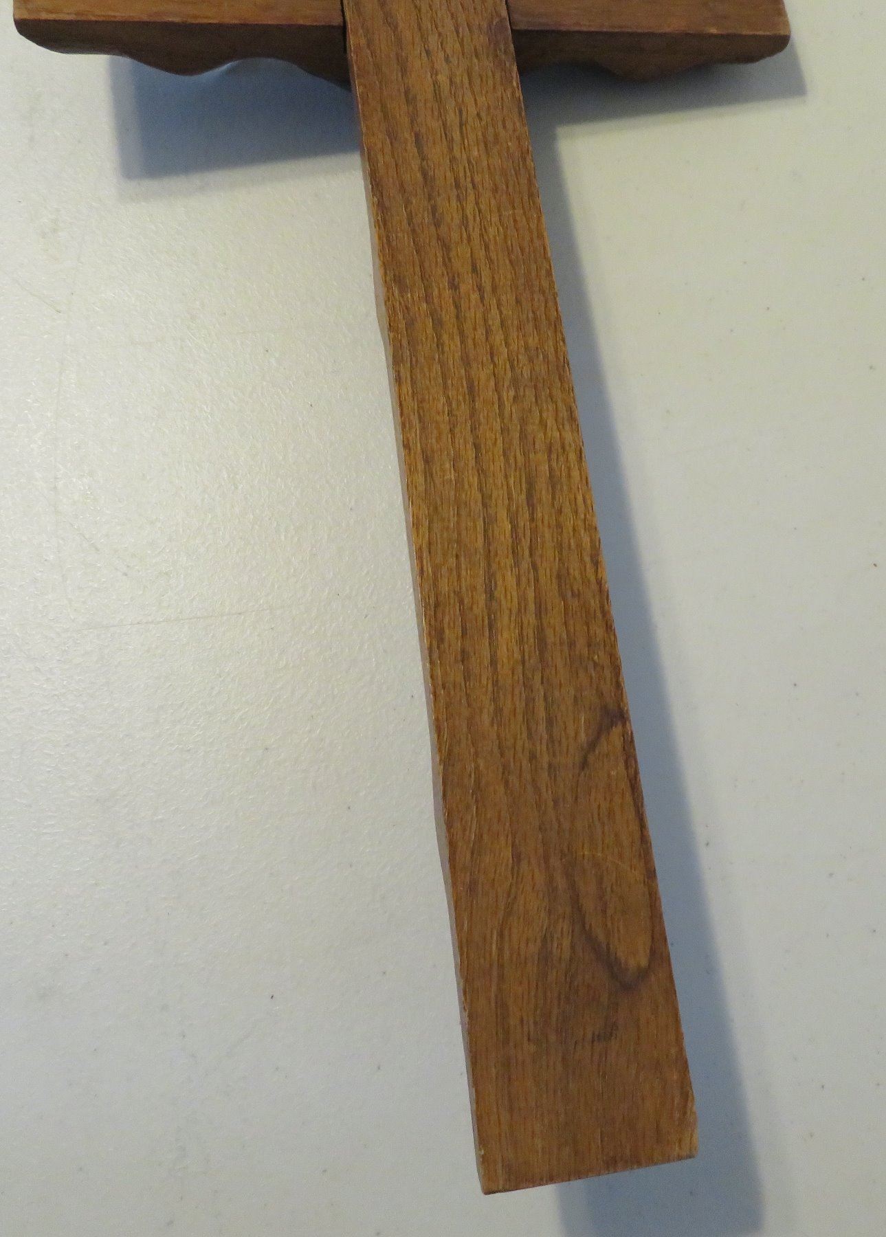 Antique Religious Crucifix, c. 1940s. Made of wood and bronze, the item measures 9 1/4" x 17 3/4" x 1 3/4". Mexico. INRI plaque: Iesvs Nazareavs Rex Ivdaeorum, Jesus of Nazarath, the King of the Jews. Condition: Good, nice patina, crack on shoulder, see images. Shipping: $30.00 w/insurance and signature, due to length and weight.