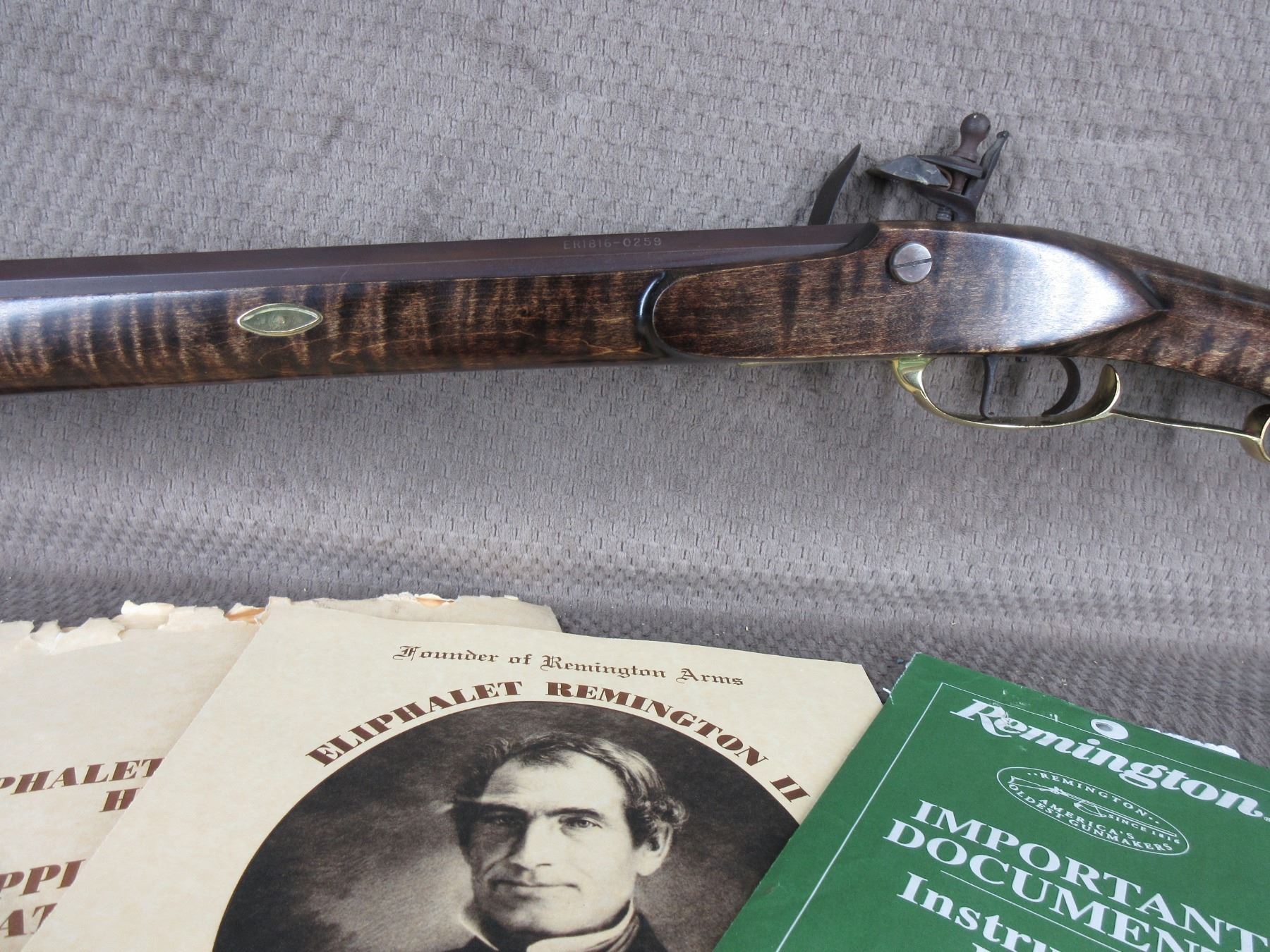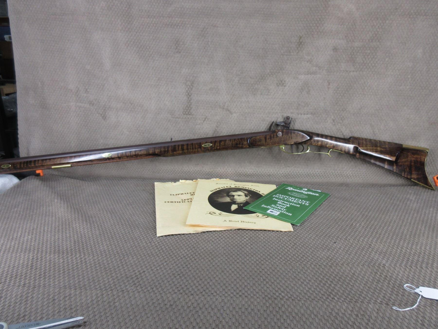 Antique - Remington Commemorative Flintlock Model 1816 in 50 Caliber - This Ketland-style flintlock, 39" Oct. brown barrel 1:66" twist, curly maple stock, brass buttplate, toe & nosecap, and hand engraved patchbox, 56" overall length, approx 8 lbs. Manufactured in 1995 by outside gunsmith for Remington Custon Shop with a limited number of guns made and this one is #259. Like new condition, don't think it has been shot and comes in original box.