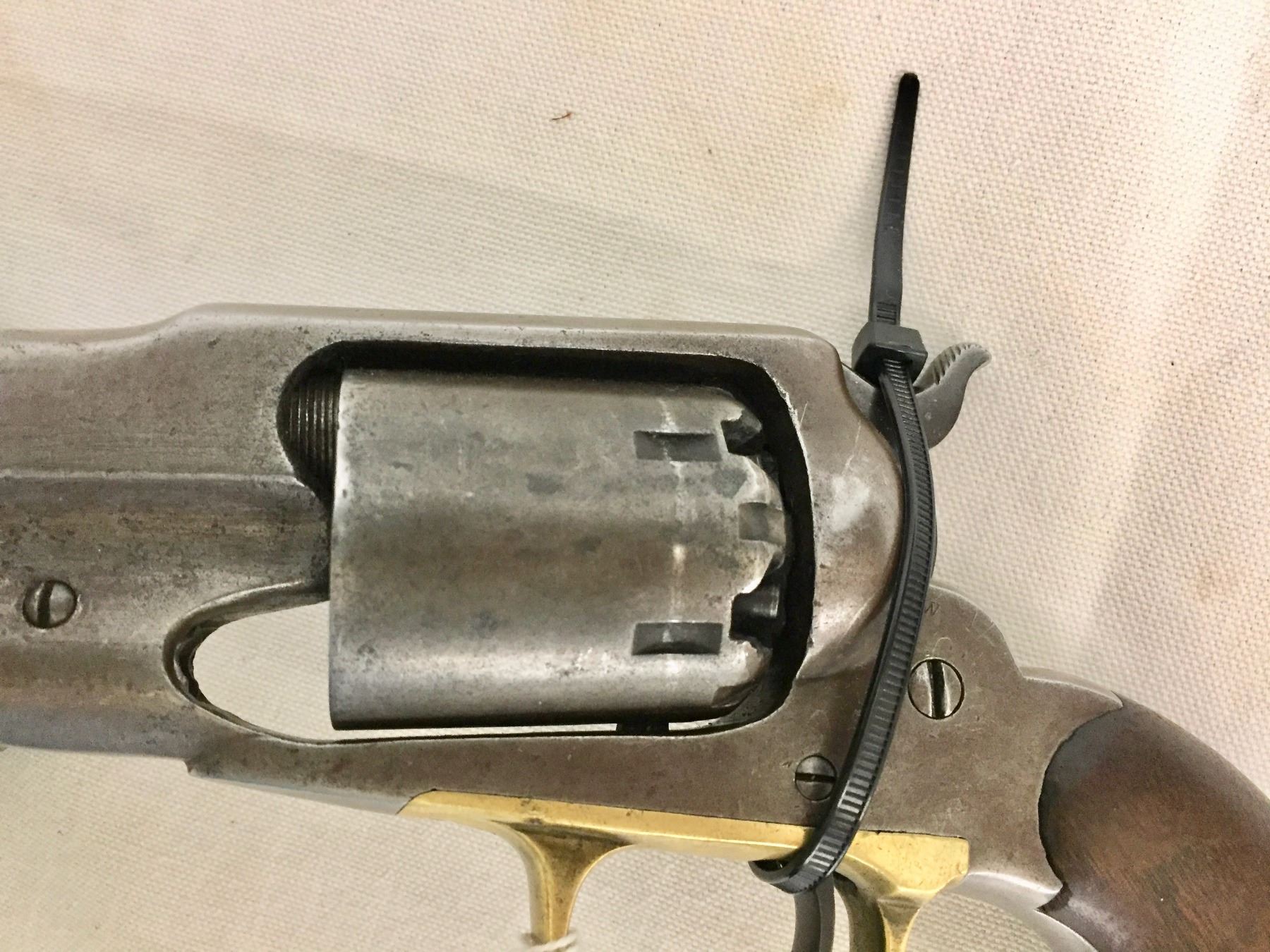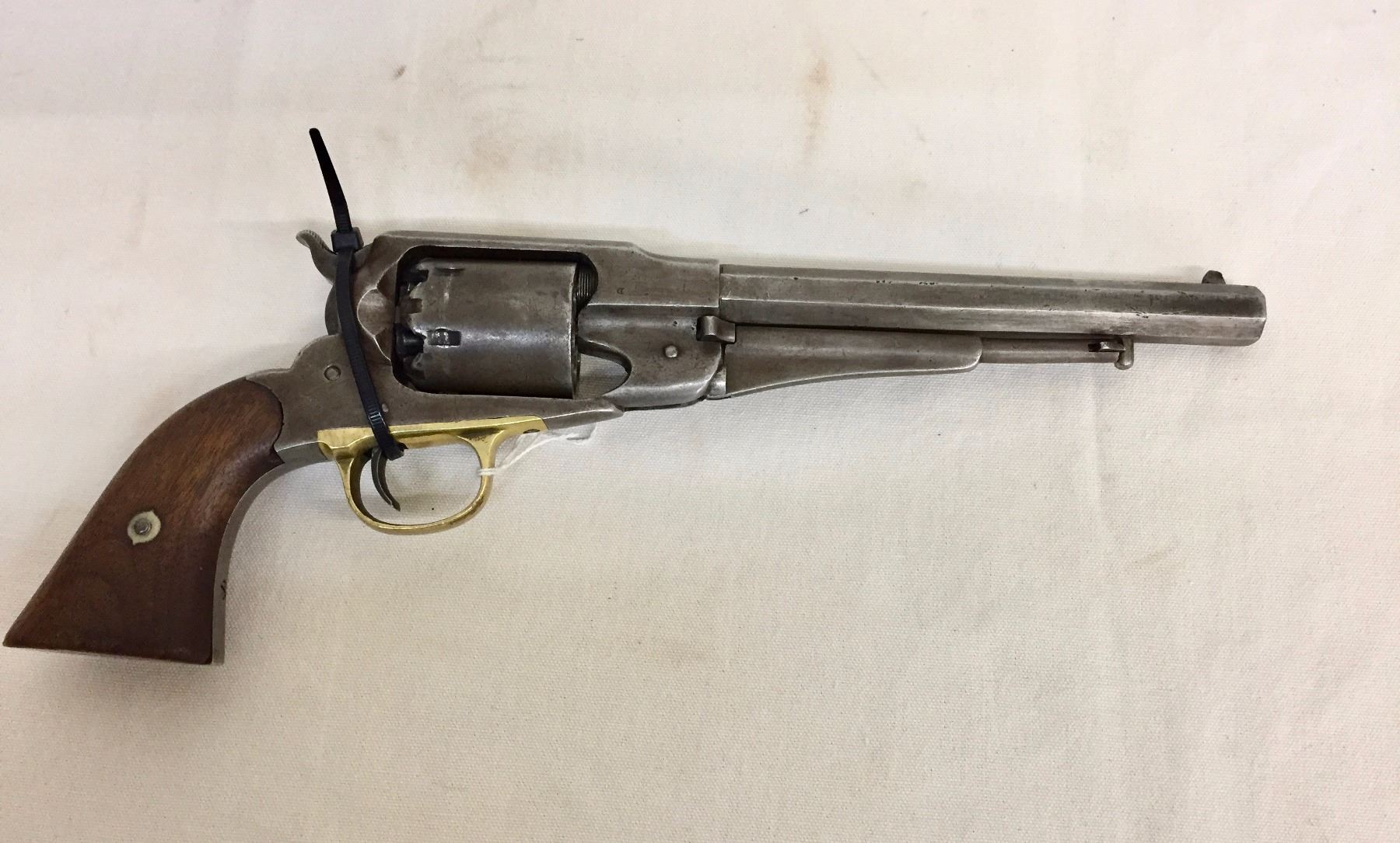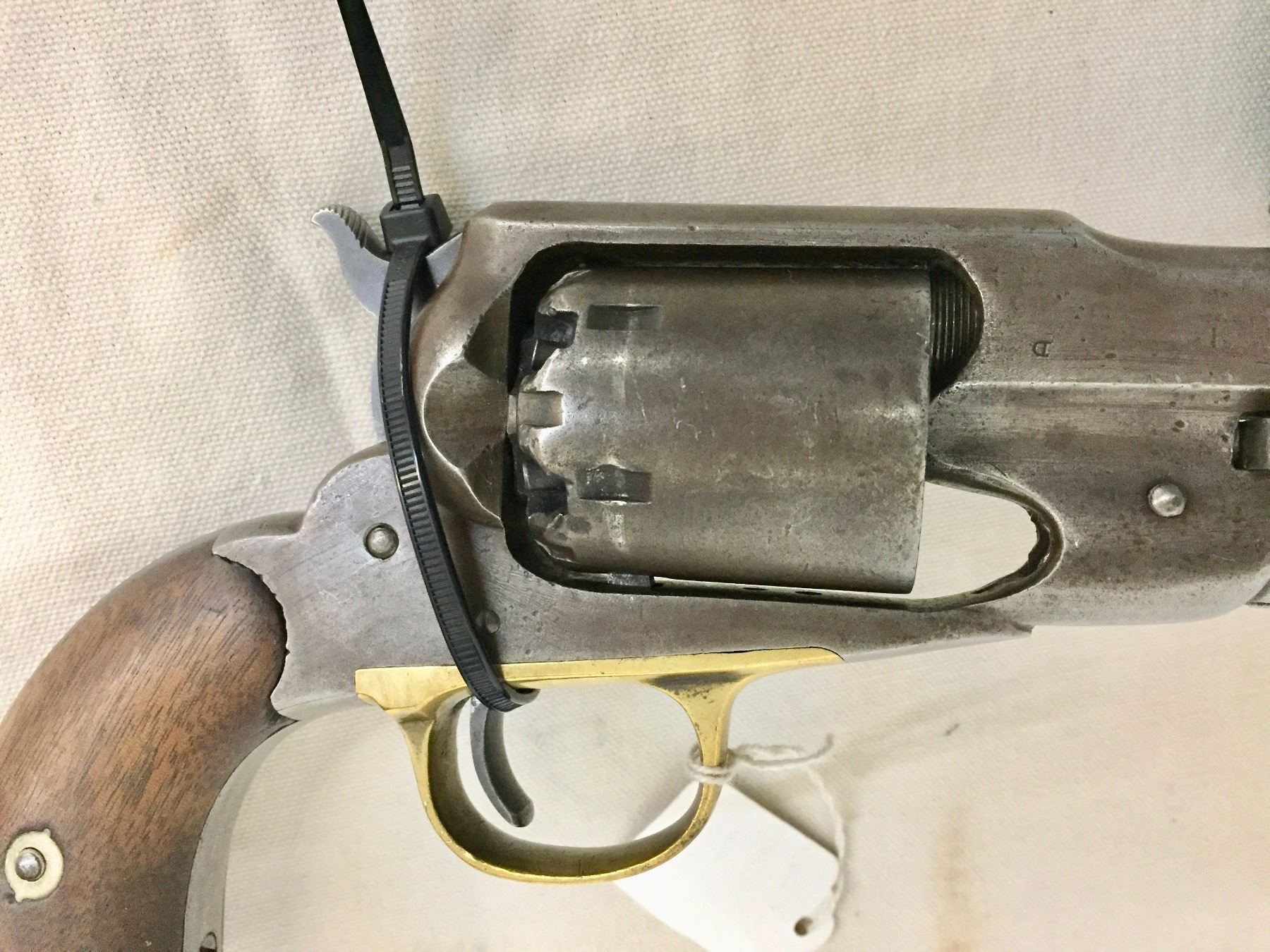 Description: Antique Remington New Model Army .44 Revolver. We are selling this as an antique / curio item and not warranted safe to shoot. No FFL paperwork required on this antique pistol which was made pre-1898. We will only ship this item to the United States and only where it is legal to do so. Please know your local/state laws before buying. Maker: Remington. Approx. Age: Circa late 1860’s. Size: Approx. 14” long overall x 5 1/8” high. Condition: Fair for its age, wear expected. Barrel has been replaced. Seems to function and cycle properly, but we have not tested it in any way. Please look closely at the pictures - they are an important part of our description. Shipping: There will be a $10 handling / packaging fee for shipping this lot. The actual cost of postage will be added on top of that.