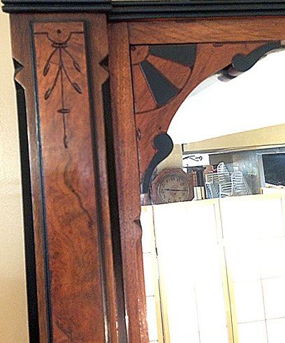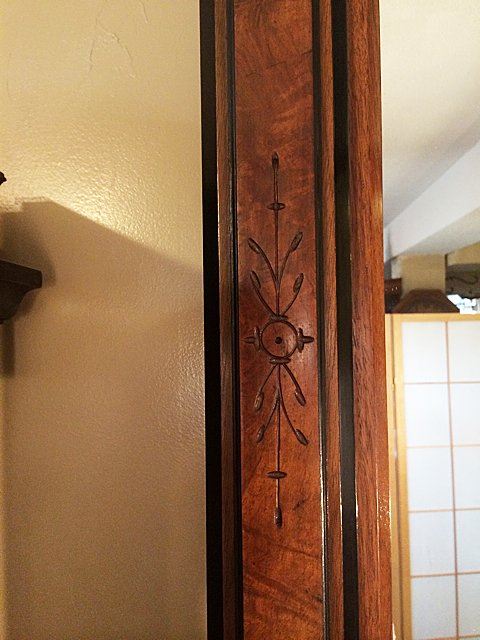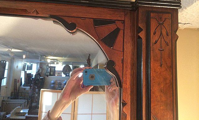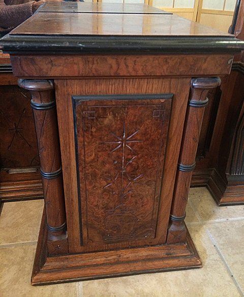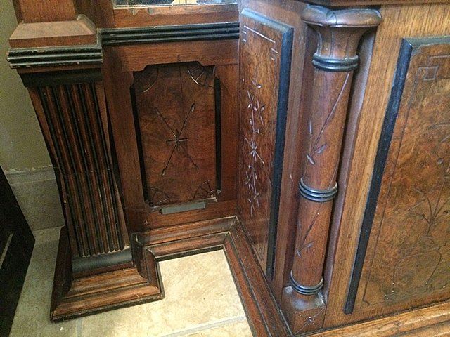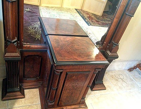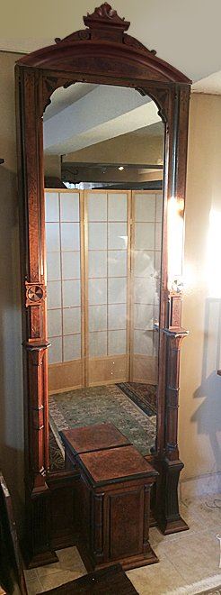Antique Walnut & Burl Rennaisance Revival Pier Mirror. Nicely burled and incised with original black painting all throughout mirror, all in original finish. Very unusual pedestal section at base with burl top. Beautiful Walnut & Burl Rennaisance Revival Pier Mirror. Measures approx. 7 1/2 feet tall x 32" wide.