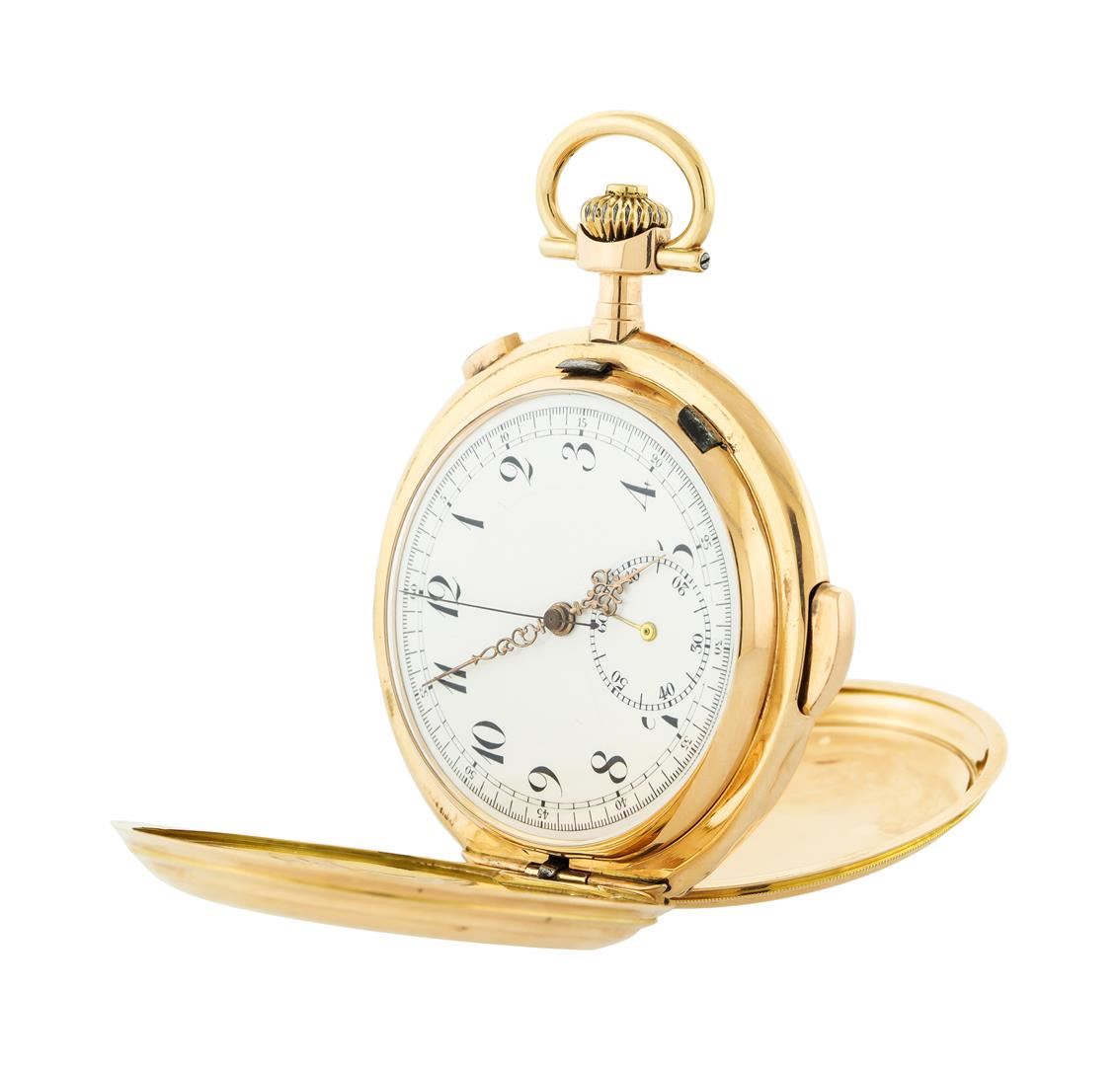 One Repetition Chronograph antique 18KT Rose Gold, 1/4 hour repetition-hunting-pocketwatch with chronograph, gold plated movement, Swiss anchor lever, flight weights for the breaking of the strike sequel, matted chronograph levers, strike sequence on 2 bell springs over pusher at 6 o'clock, chronograph pusher at 12 o'clock. Case: Hunter, 18KT Rose Gold, measures 57mm in diameter, case number 282938. Case signed "18K". Dial: White enamel with painted Arabic numerals, Louis-XVI minute and hour hands, deep end second field, black 5-minute, hand position shift through slider at 4 o'clock. Condition: G-4 FINE, (good working order and fair condition). Note: Case has some dents. Total Weight of Watch: 109.60gm.