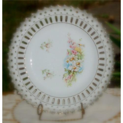 unmarked antique reticulated,gold trimmed, decorative plate. This is a very delicate, victorian looking, plate. I'm almost certain this estate piece belonged to my Great Great Grandmother; which would date it in the late 1800's, simply because it is unmarked. Many of the things that I have of hers are indeed unmarked.
