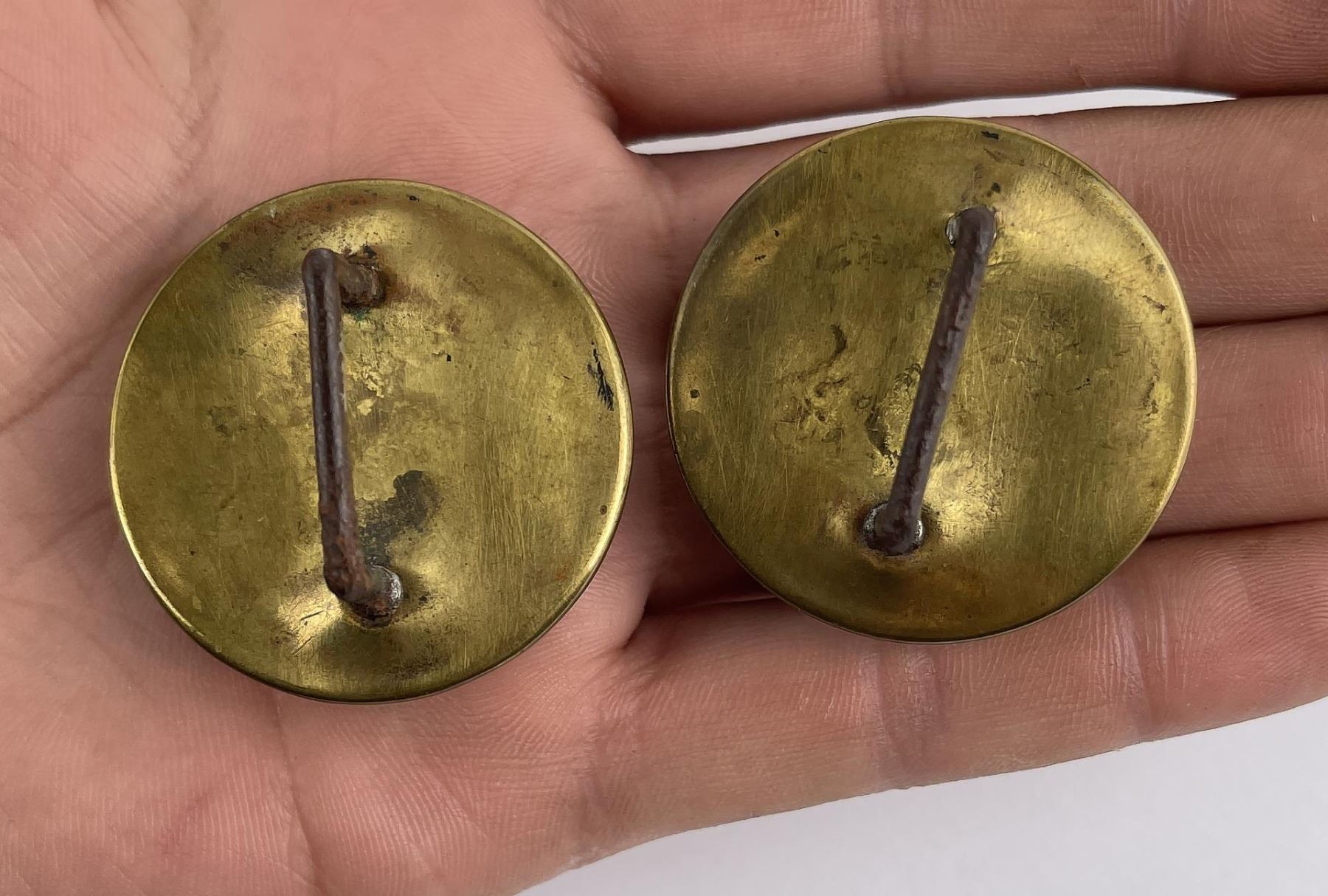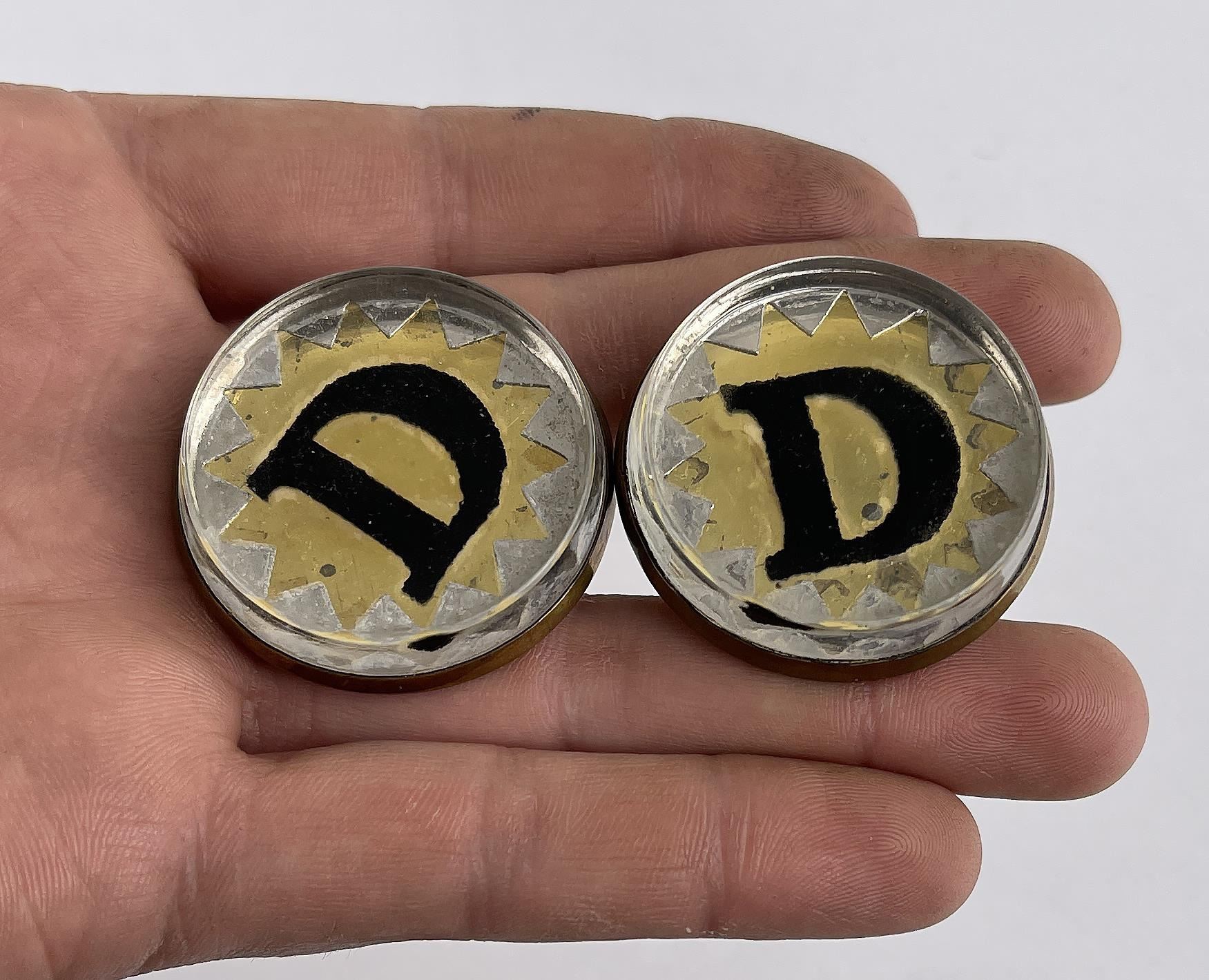 Nice old pair. Reverse painted. Single letter monogram with 'D' initial and gold foil rosette.