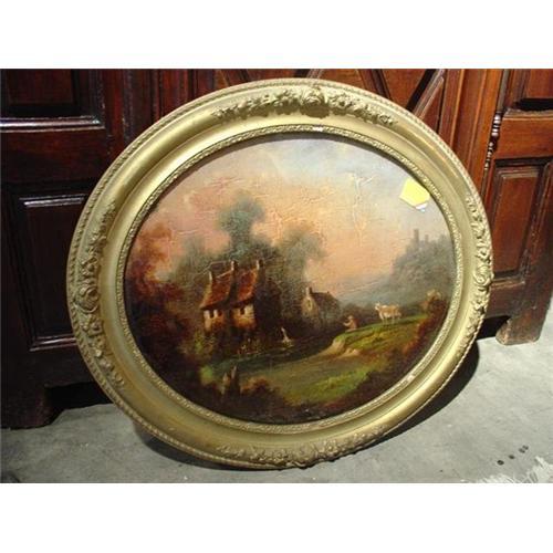 </font></strong>This is an antique French oval framed, convex reverse glass pastoral painting. The signature is not visible, but it's in good condition with some cracking to the paint. We believe it to be circa 1890.