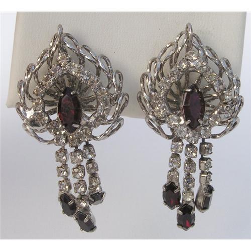 What an incredible pair of antique earrings! Done as an openwork puffed leaf these are studded with perfect rhinestones and ruby-colored crystals. They measure 2" long and have 3 dangle drops from each. You can see on the back where these were soldered, a practice that ended in the 20's. They are perfect and pristine. It's hard to find these in this kind of condition so don't miss out.