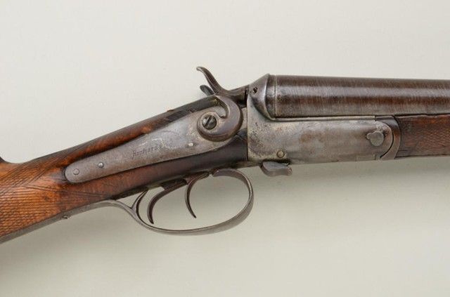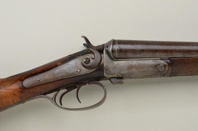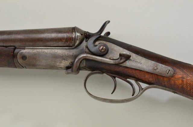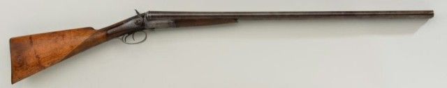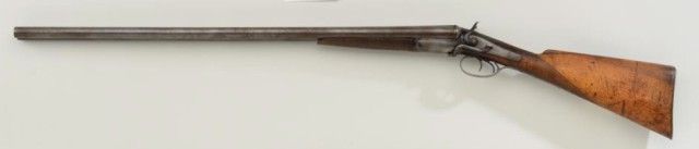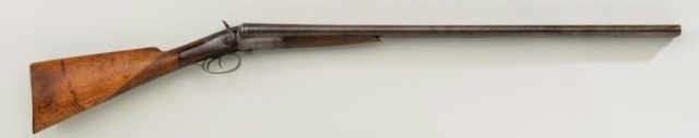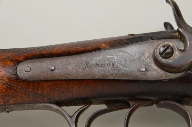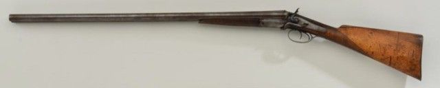 Antique Richards side lever exposed hammers SxS shotgun, 12 gauge, 32” Damascus barrels, checkered wood stocks, #NVSN. This gun is in overall fair to good condition showing considerable damascene pattern on barrels,good actions, rough bore, wood stocks are worn with some scattered old losses and old crack at the top of the butt stock above the back action lock plates; a nice display piece. Fair condition overall. Est.:$100-$200.