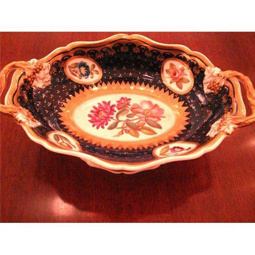 A Very Beautiful Dessert Basket on attached Stand, part of a Dessert Service by the English Porcelain Factory of J.W. Ridgeway and Sons, Circa 1810. This Basket of Soft-Paste Porcelain is Decorated with Dark Cobalt Blue with Reserves of Pure White Porcelain decorated with Naturalisticly painted Flowers, Executed with the Greatest Skill using various shades and shadows to give depth and demension to each panel. The Slight Curves of the Border of the piece shows a very early example of the Graceful and Elegant Rococo-revival form. Bright and Lavish Gilt work embellishes the dish all over. In Excellent Antique Condition. No Chips, cracks, breaks or repairs of Any kind. Please check my other listings for Companion Pieces in this Beautiful, High Quality Porcelain.