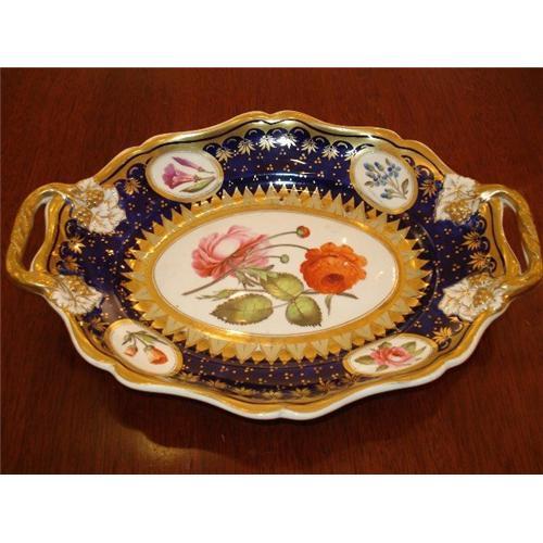 A Very Beautiful Oval Tray with Handles, part of a Dessert Service by the English Porcelain Factory of J.W. Ridgeway and Sons, Circa 1810. This Tray of Soft-Paste Porcelain is Decorated with Dark Cobalt Blue with Reserves of Pure White Porcelain decorated with Naturalisticly painted Flowers, Executed with the Greatest Skill using various shades and shadows to give depth and demension to each panel. The Slight Curves of the Border of the piece shows a very early example of the Graceful and Elegant Rococo-revival form. Bright and Lavish Gilt work embellishes the dish all over. In Excellent Antique Condition. No Chips, cracks, breaks or repairs of Any kind. Please check my other listings for Companion Pieces in this Beautiful, High Quality Porcelain.