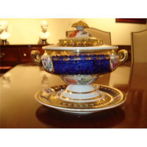 A Very Beautiful Dessert Tureen with Stand, part of a Dessert Service by the English Porcelain Factory of J.W. Ridgeway and Sons, Circa 1810. This Tureen of Soft-Paste Porcelain is Decorated with Dark Cobalt Blue with Reserves of Pure White Porcelain decorated with Naturalisticly painted Flowers, Executed with the Greatest Skill using various shades and shadows to give depth and demension to each panel. The Slight Curves of the Border of the piece shows a very early example of the Graceful and Elegant Rococo-revival form. Bright and Lavish Gilt work embellishes the dish all over. In Excellent Antique Condition. No Chips, cracks, breaks or repairs of Any kind. Please check my other listings for Companion Pieces in this Beautiful, High Quality Porcelain.