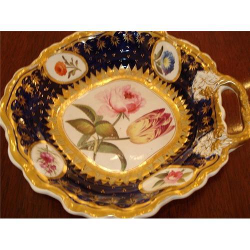 A Very Beautiful Oval Shell with Handle, part of a Dessert Service by the English Porcelain Factory of J.W. Ridgeway and Sons, Circa 1810. This Shell of Soft-Paste Porcelain is Decorated with Dark Cobalt Blue with Reserves of Pure White Porcelain decorated with Naturalisticly painted Flowers, Executed with the Greatest Skill using various shades and shadows to give depth and demension to each panel. The Slight Curves of the Border of the piece shows a very early example of the Graceful and Elegant Rococo-revival form. Bright and Lavish Gilt work embellishes the dish all over. In Excellent Antique Condition. No Chips, cracks, breaks or repairs of Any kind. Please check my other listings for Companion Pieces in this Beautiful, High Quality Porcelain.