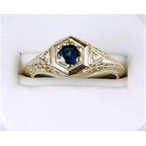 Antique 14k White gold ring featuring a beautiful Blue Sapphire=.51 CARATS! There is a Diamond set each side as accent to the Sapphire. This lovely filigree ring is a size 6 3/4 and I can easily resize it for you. It can also be worn as an Antique Sapphire Engagement Ring.