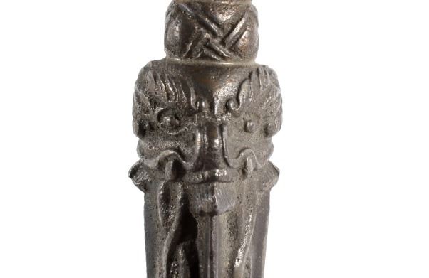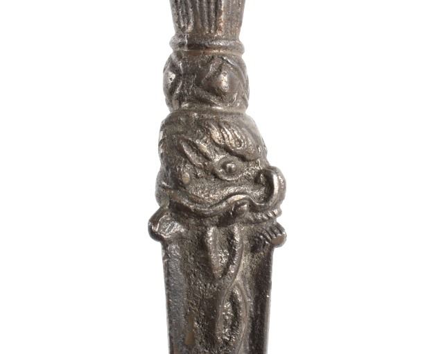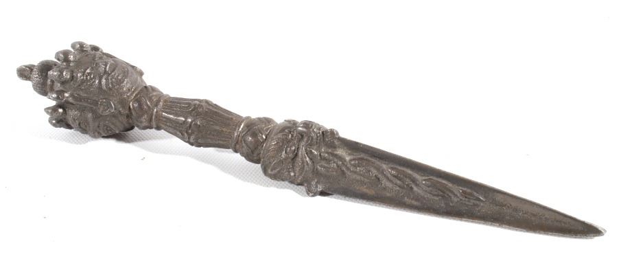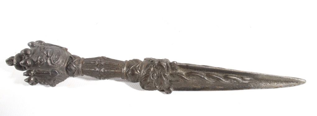 Featured in this lot we have a antique Tibetan ritual iron dagger called a Phurba. The Phurba also called the Kilas is a ritual knife used in Buddism primarily by shamans. The knife holds three main points of symbolism at the base of the handle is a set of three faces representing the god of wrath, below that where the grip meets the blades is the head of a dragon, and the three blades represent the severing of sins. This knife was not used in combat but was considered a weapon against the spiritual. The knife is made out of iron and is from the early 19th century. Some Phurba's have been known to have sold in to the three thousands and are quite the collector piece. The knife is in good condition for its age. It measures 8 3/4" long.