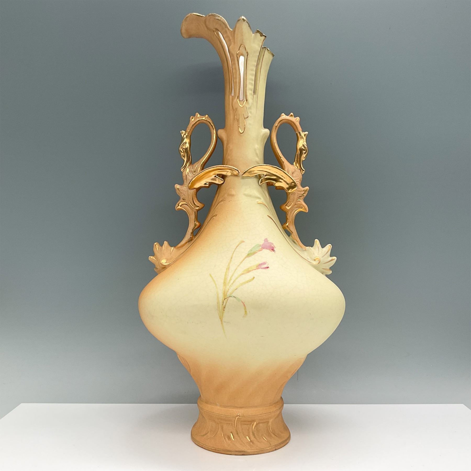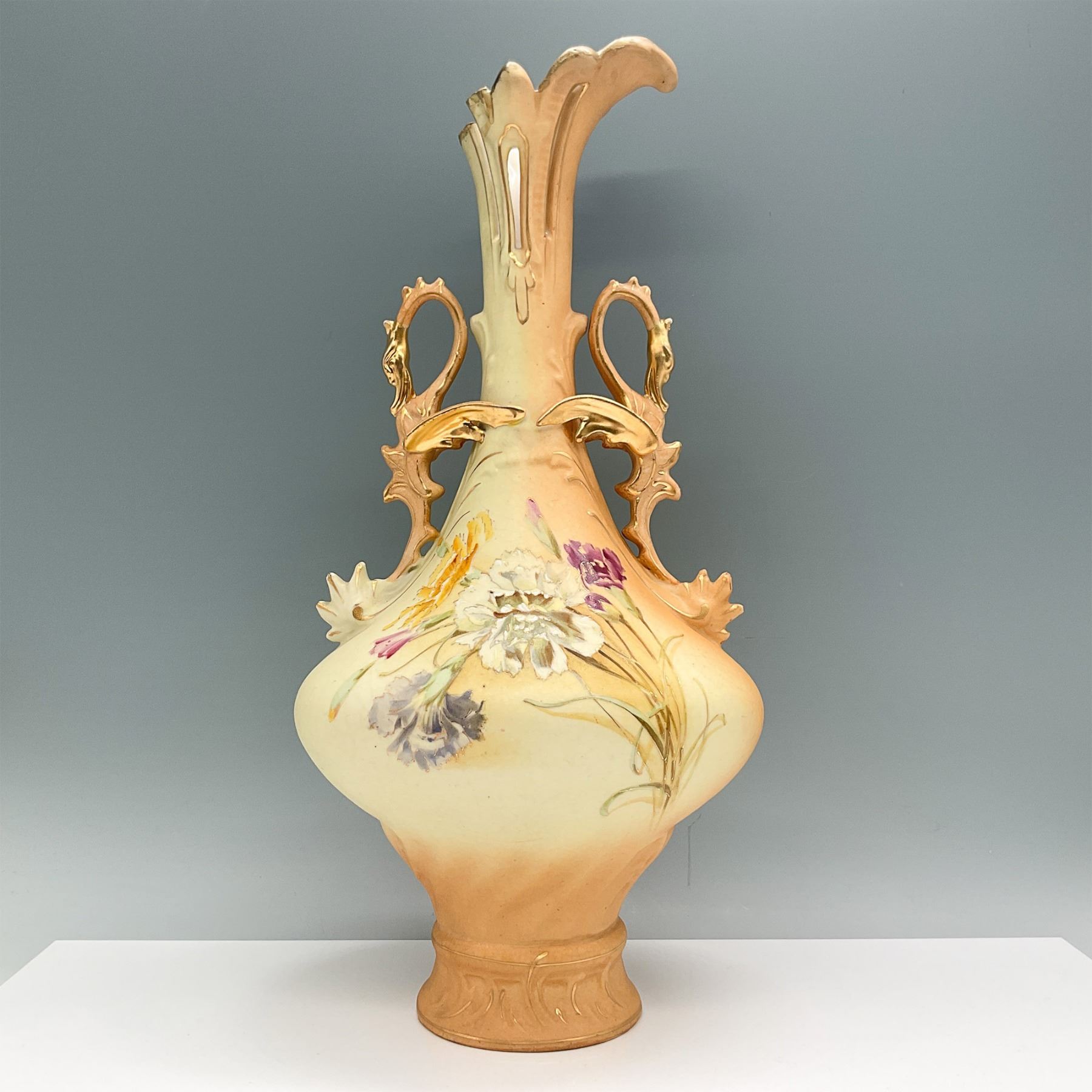 This exquisite antique vase by Robert Hanke of Austria features ornate dragon handles and a gracefully flared neck. The hand-painted floral designs, highlighted with soft pastel colors and accented with gold, reflect the elegance of late 19th to early 20th-century Austrian craftsmanship. The vase is marked with the Robert Hanke backstamp on the base, confirming its authenticity. Measuring 14.5"H, this piece is a beautiful representation of Hanke's distinctive artistry and is a striking addition to any fine porcelain collection.