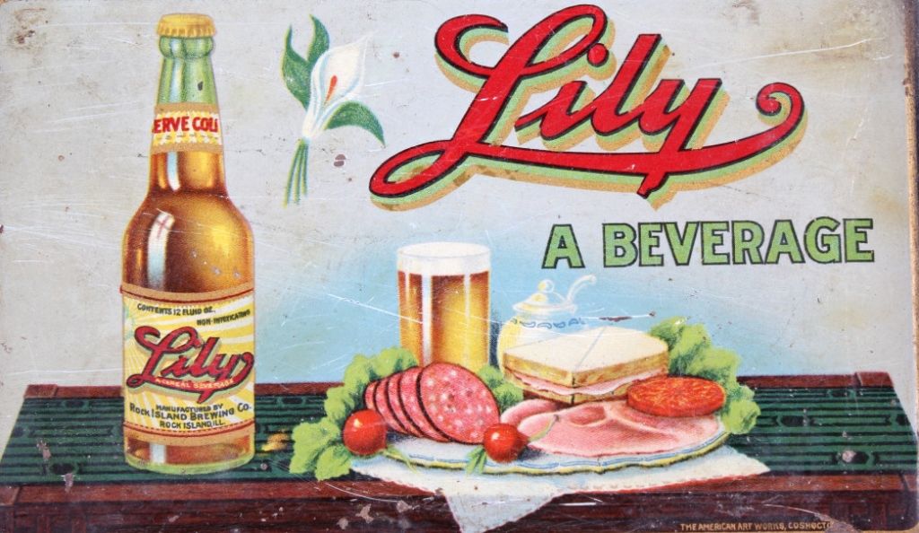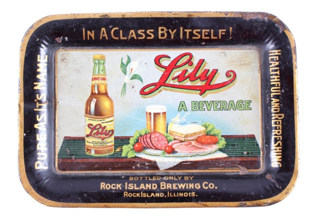 This is a Lily Beverage Rock Island Brewing Co. original antique advertising tip tray. This is a rarely seen tip tray showing great graphics. Top right shows slight rust, overall a great piece. Measures 4 5/8"x6 5/8"