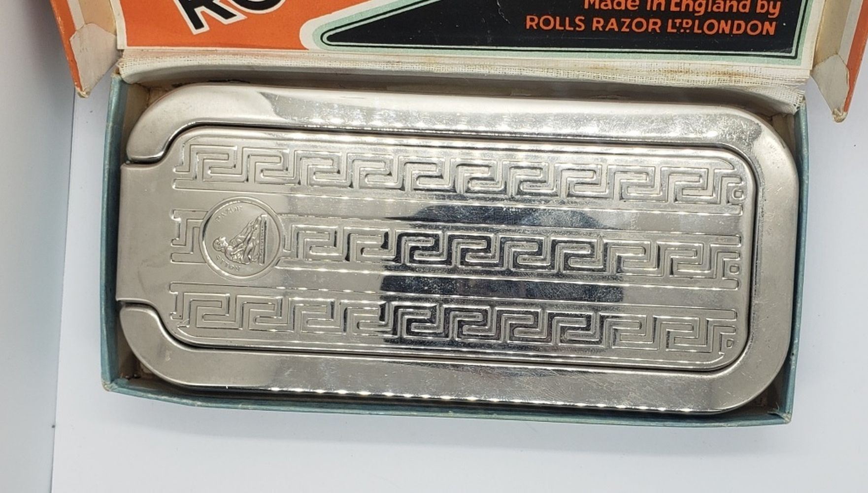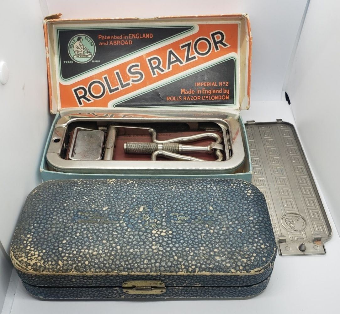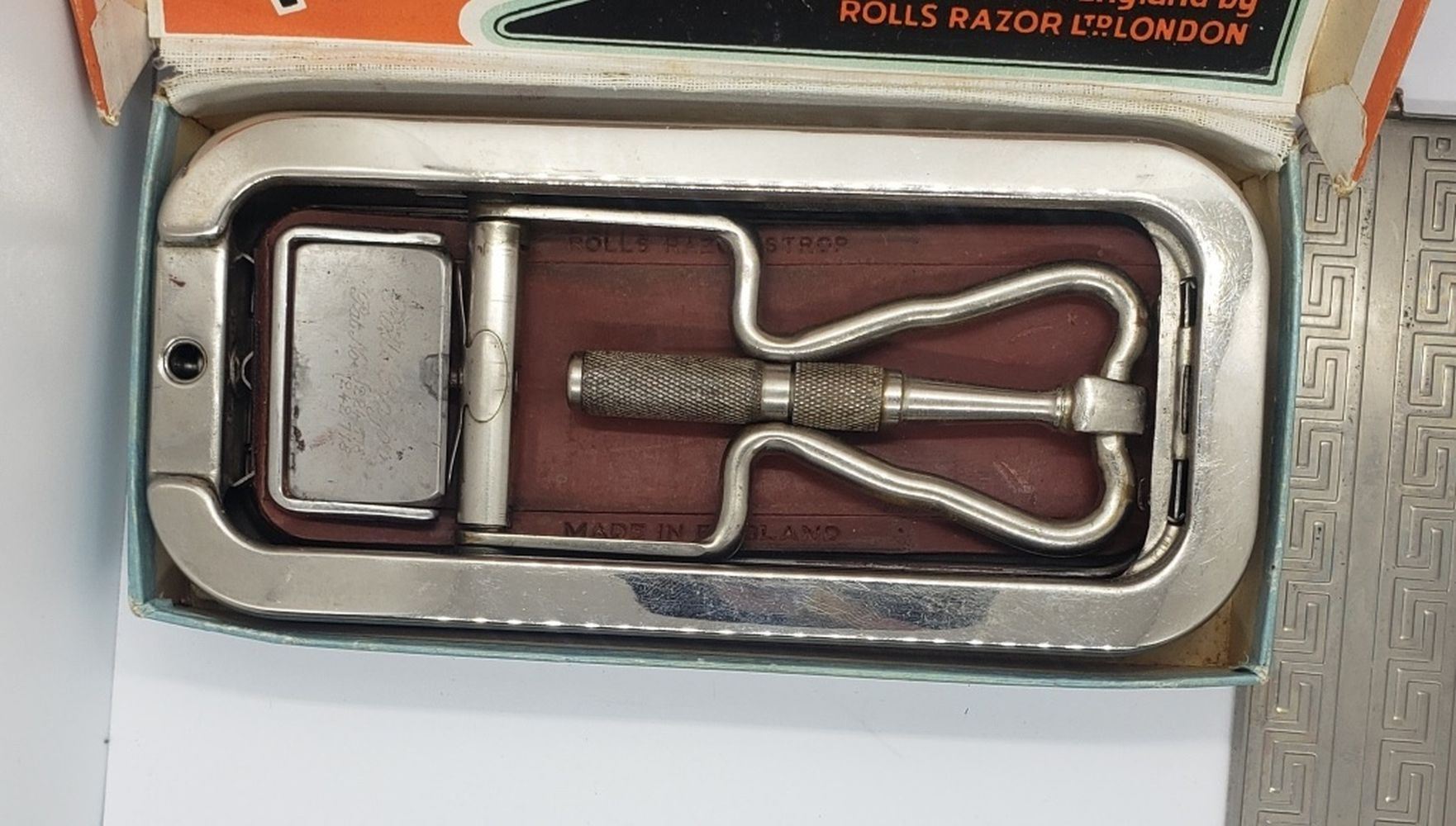 Needs a light cleaning. The travel case was bought along side with this razor. Nice metal original case. The original box has damage. Paperwork included.