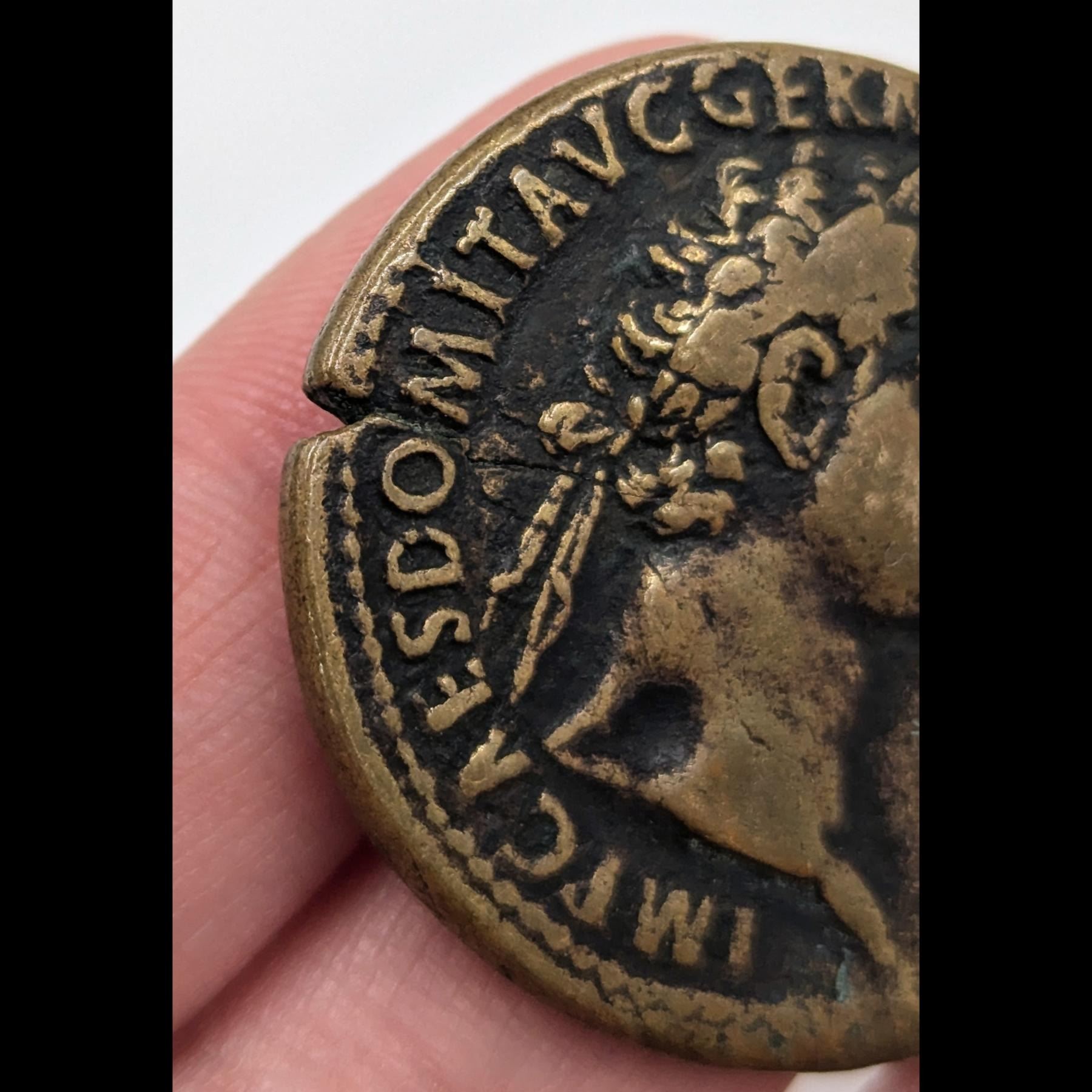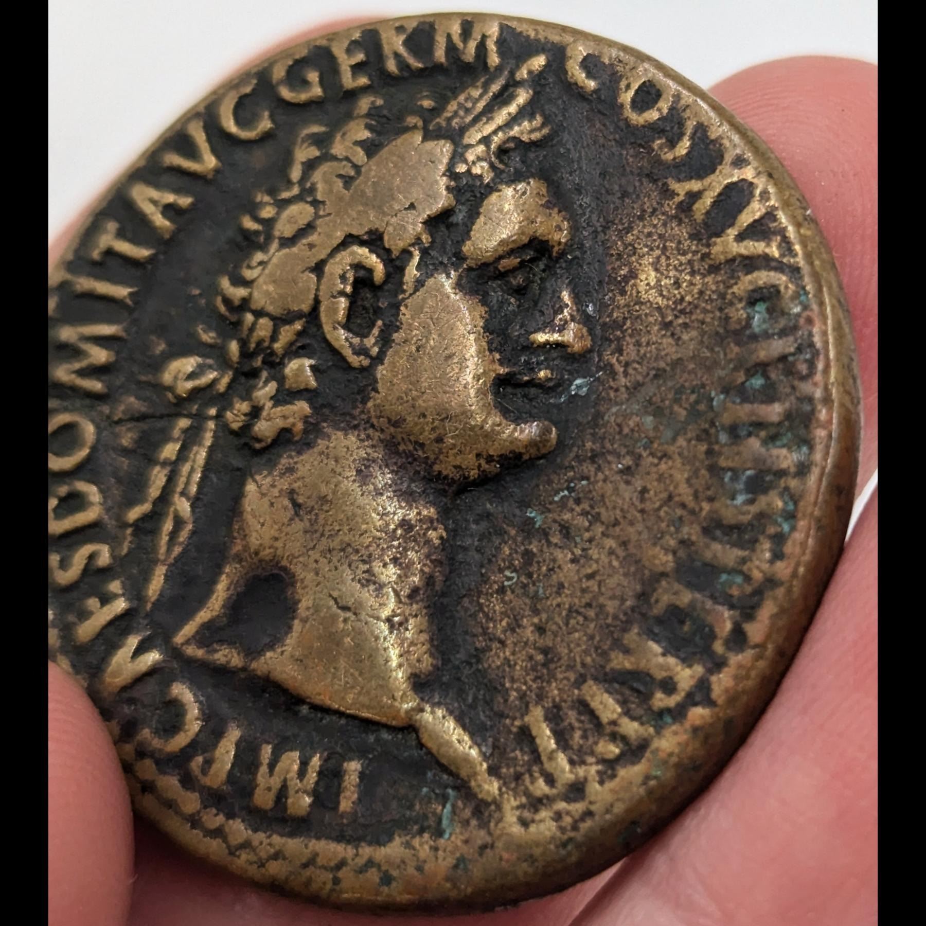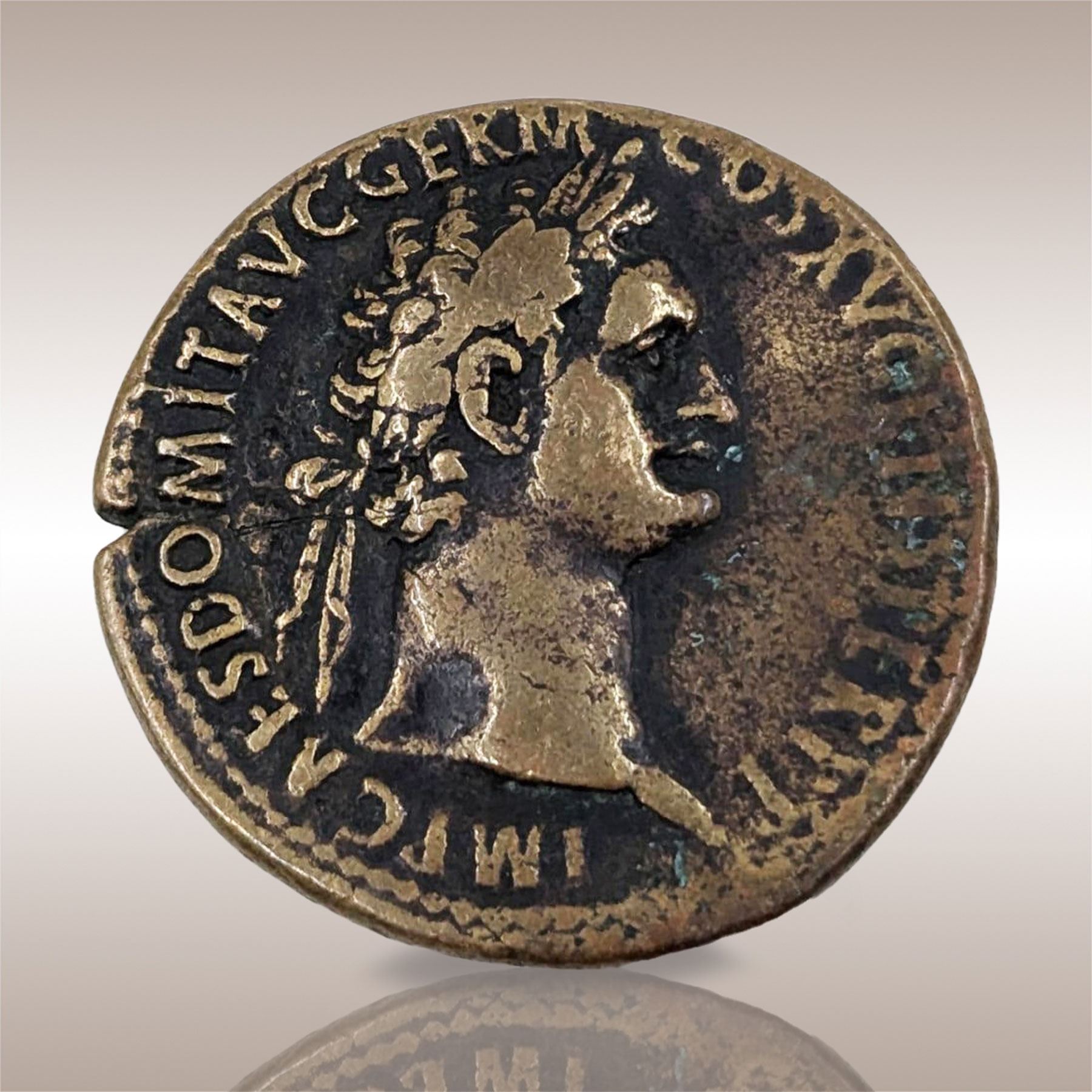 Antique Roman Imperial Domitian Bronze Coin. Measures approximately 1 1/4" in diameter.