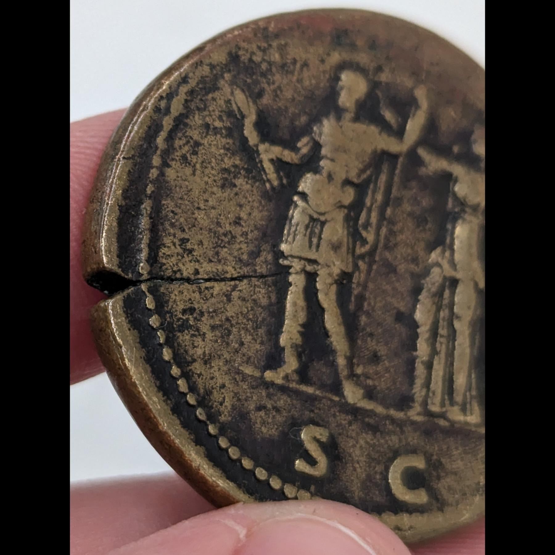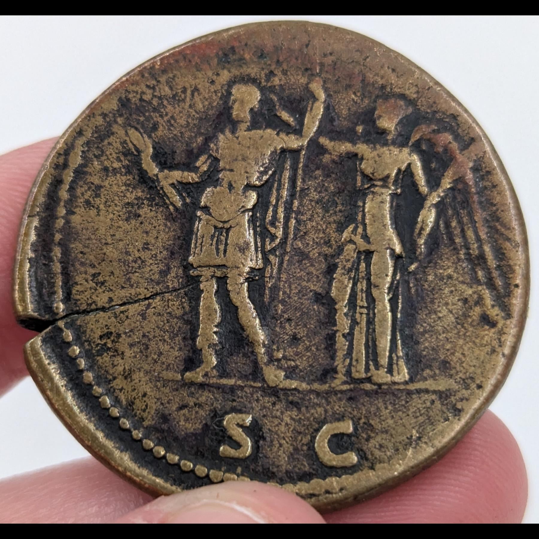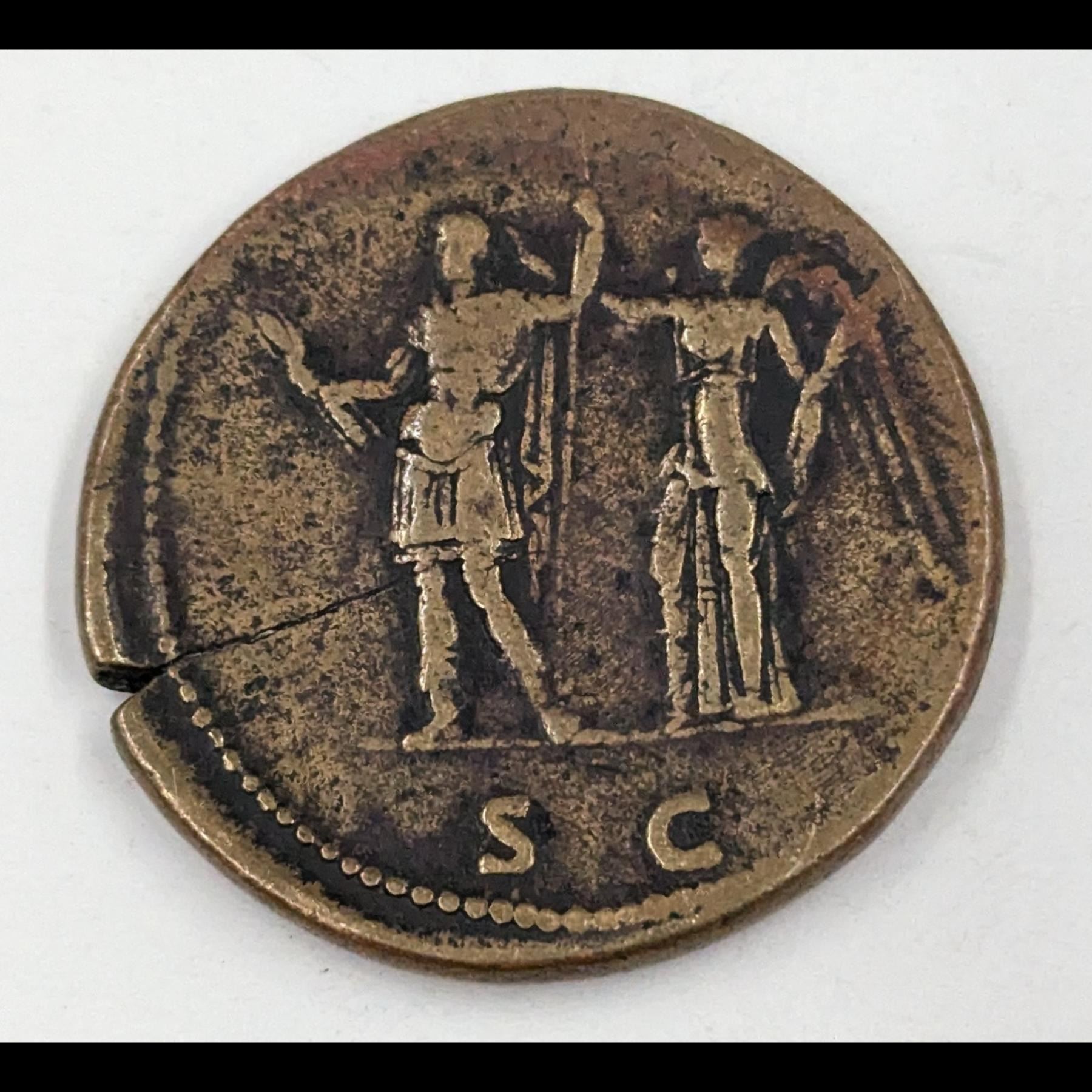 Antique Roman Imperial Domitian Bronze Coin. Measures approximately 1 1/4" in diameter.