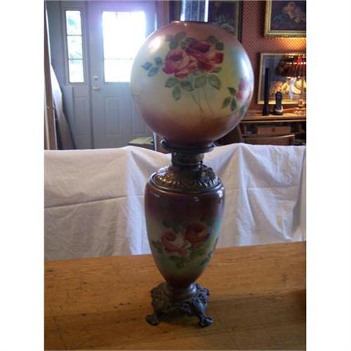 This is a beautiful lamp with hand painted roses.Nice iron base and brass oil insert.Sorry to say,not without damage.The base is fine,but the brass insert has some breakage (see picture) which does not affect use.The bad part is the top globe,which is original to the piece,has cracks and a small hole on the back side.When it is sitting on a table against a wall it does not show but sitting out it does.Brass oil holder says FOSTORIA-with the Pat.dates around it.On the wick mover it says MADE IN US OF AMERICA.There is a number 209 on bottom of metal base.This really is a beautiful lamp even with the damage.Measures 26 3/4" to top of glass chimney.I have more pictures if you need.I will gladley e-mail them to you.