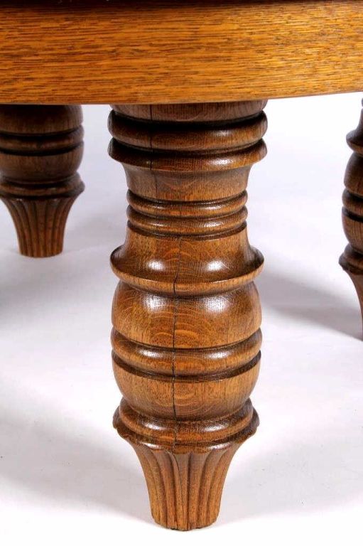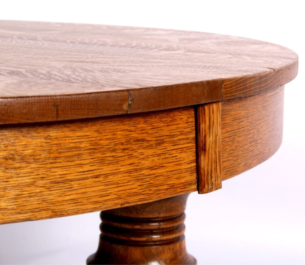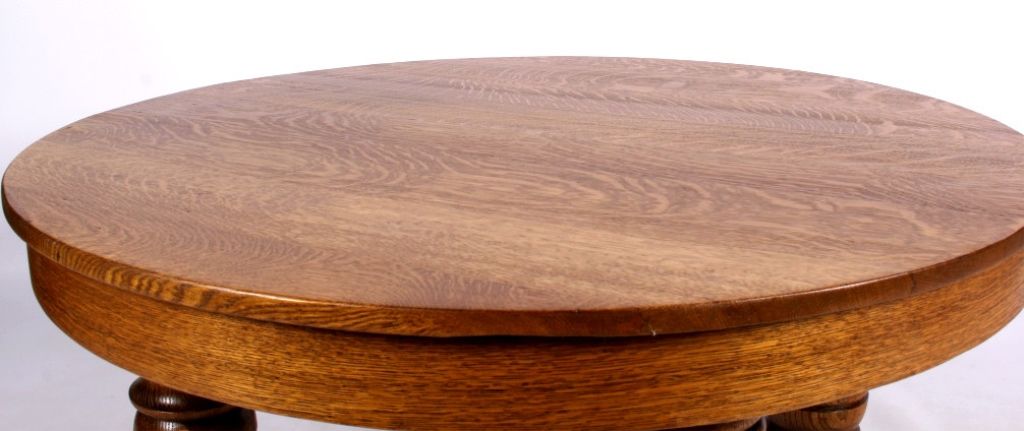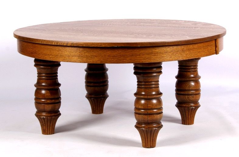 This lot features a round oak coffee table. This handsome table is made of solid wood. Originally a full size dining table, it has been modified. It is 41.5" in diameter and stands 20.25" tall.