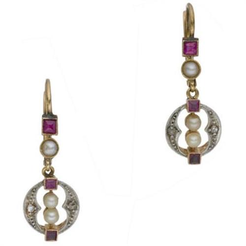 <B>Antique Ruby, Diamond, Seed Pearl, Platinum, Gold Earrings</B></I><BR><BR>The dangle earrings each feature square-cut rubies, enhanced by rose-cut diamonds, further enhanced by seed pearls, set in platinum-topped 18k gold. Total ruby weight for the pair is approximately 0.35 carat. Gross weight 2.80 grams.<BR><I>Dimensions: 1 inch x 5/16 inch</B></I><BR>*Note: earrings are designed for pierced ears <B>Condition Report:</B> Good condition.<BR><BR><BR><b>Shipping:</b> Miscellaneous Collectibles, Smal (<a target="_blank" href="http://www.heritageauctions.com/common/shipping.php">view shipping information</a>)