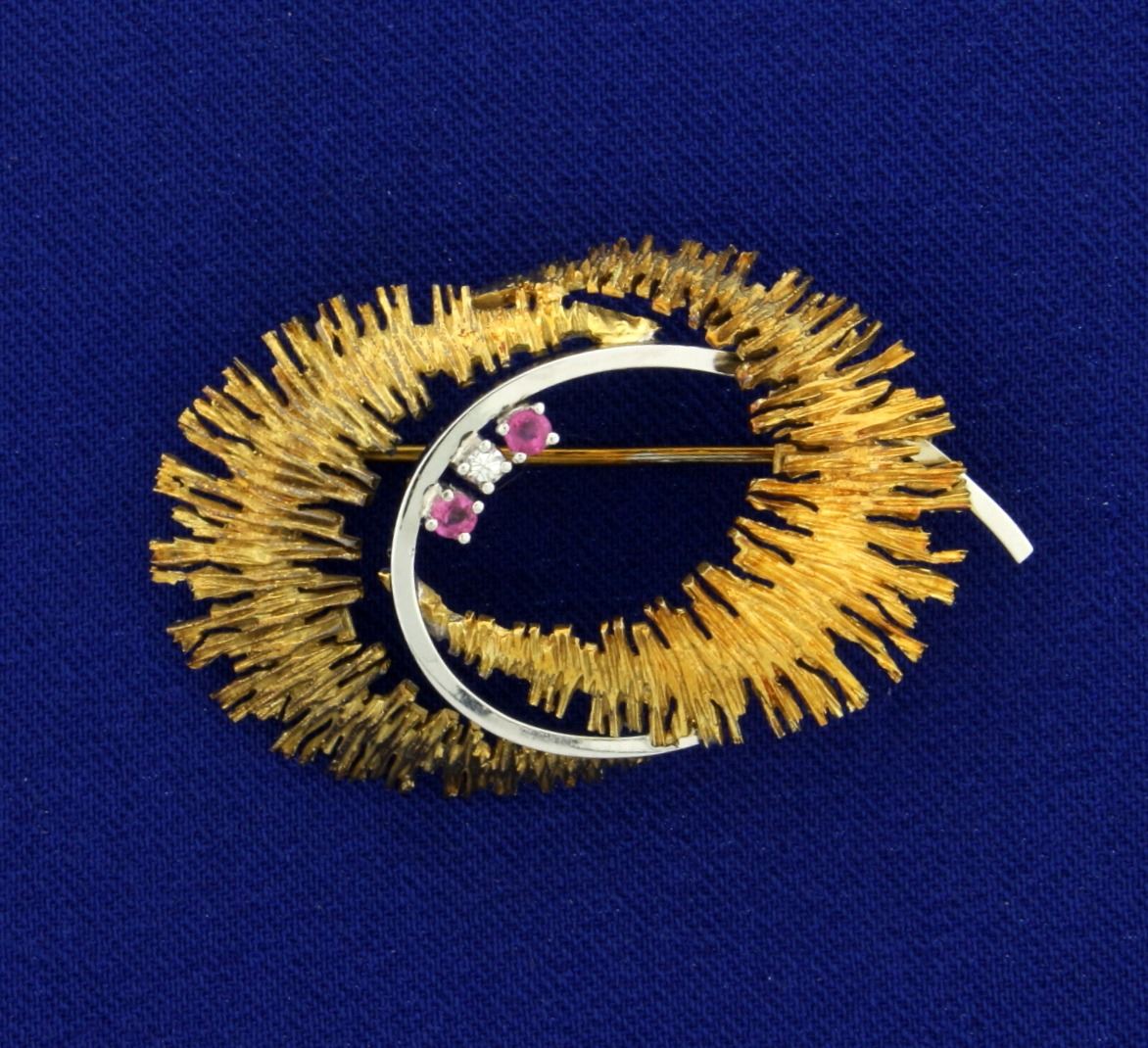 In 14k yellow and white gold, containing two 2mm rubies and a .02ct diamond. 1 3/4 inches long. 8.4g.