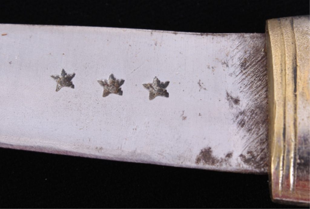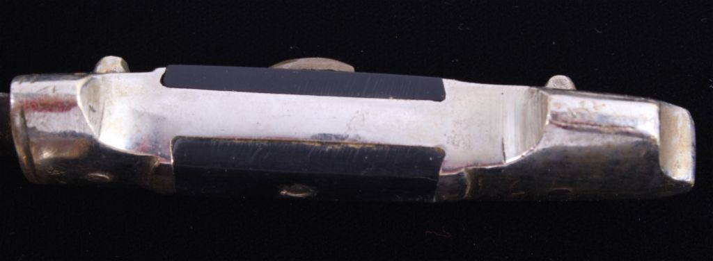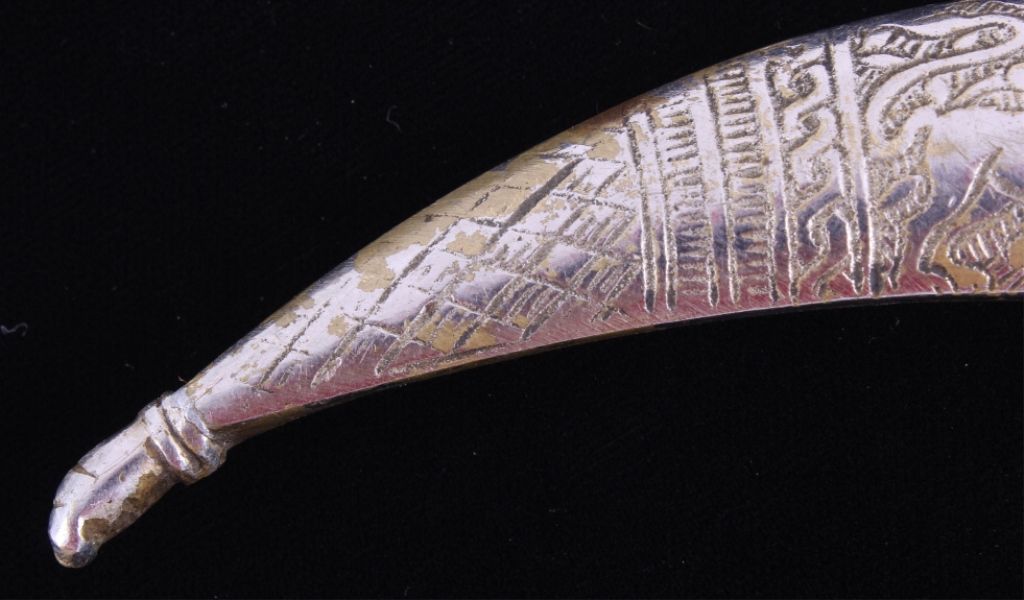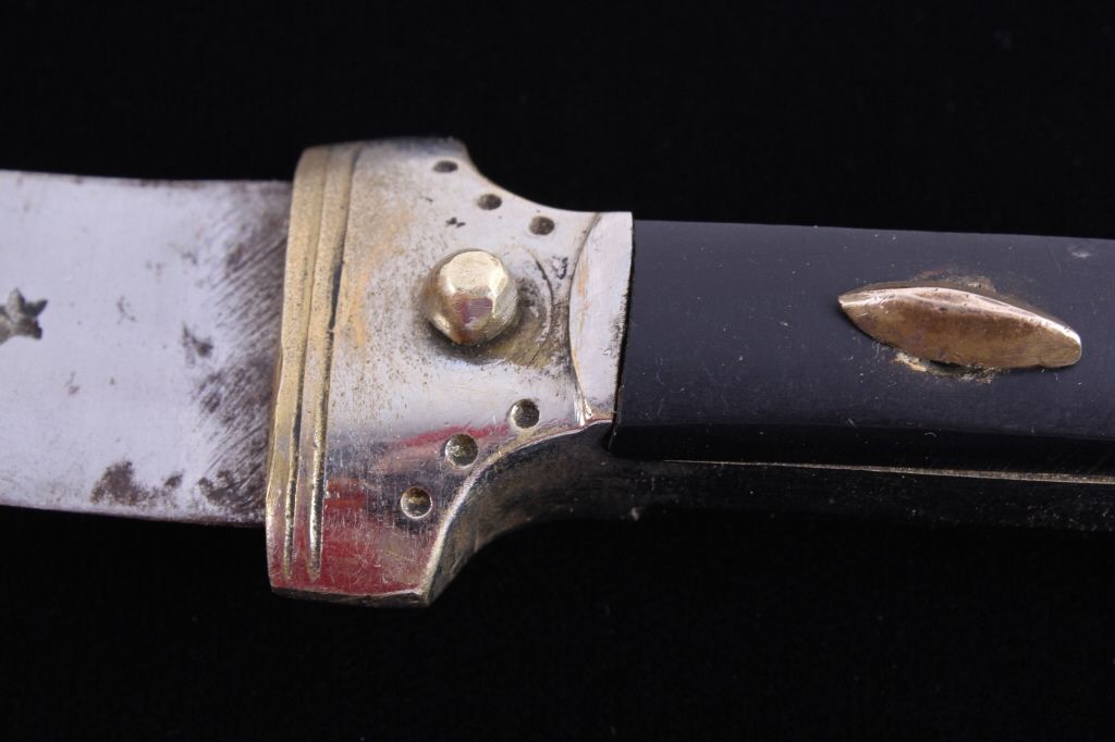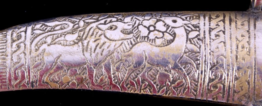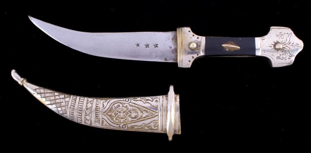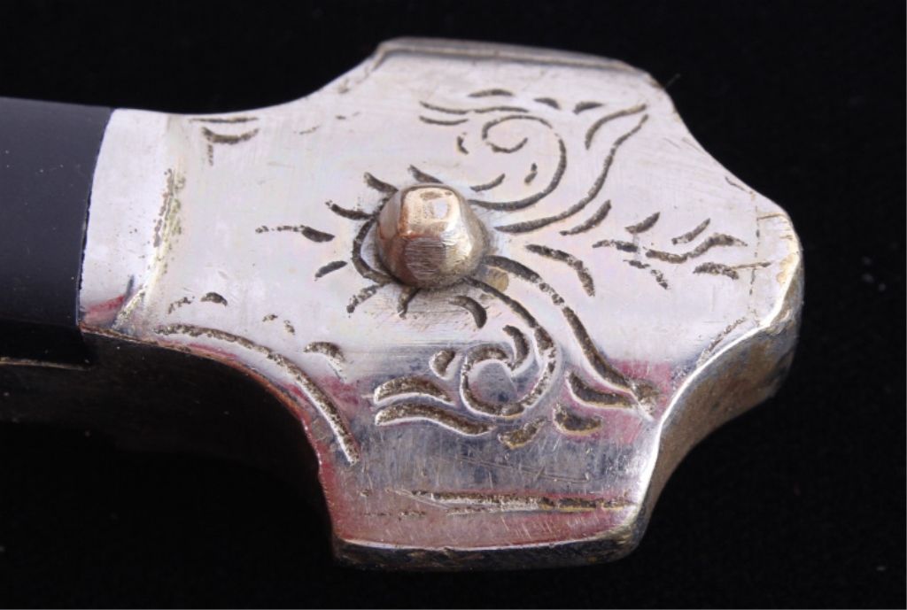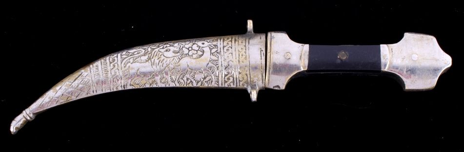 The lot features a curved blade dagger  showing intracte work across the scabbard and  handle. The piece is believed to have  Russian origins and be of antique age. The  blade has been cleaned, but does shows three star makers mark. The scabbard and handle  shows a heavily silver plated brass (has been  cleaned)  with black horn. Rare piece shows  overall solid condition. Knife in scabbard  measures 9", knife overall 8.25" with a 4.5" blade.