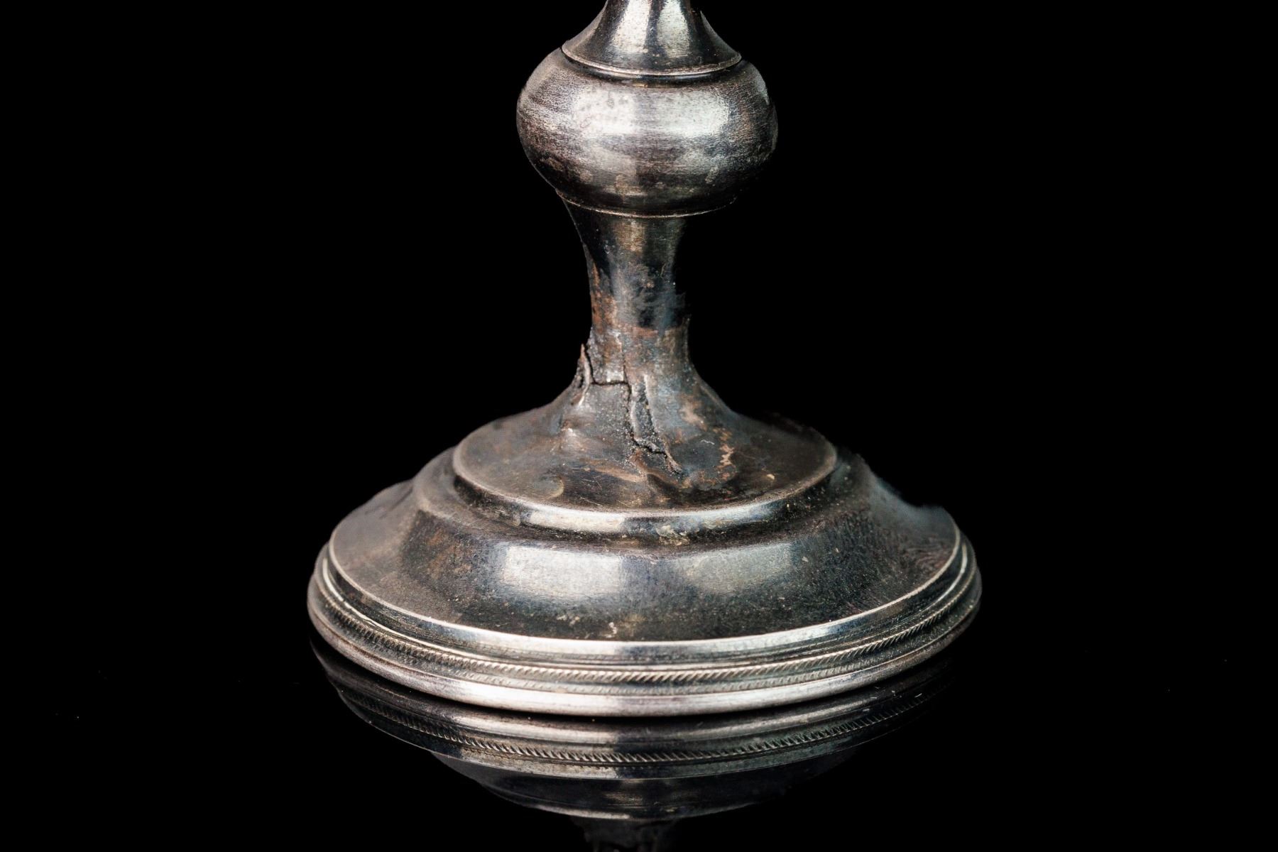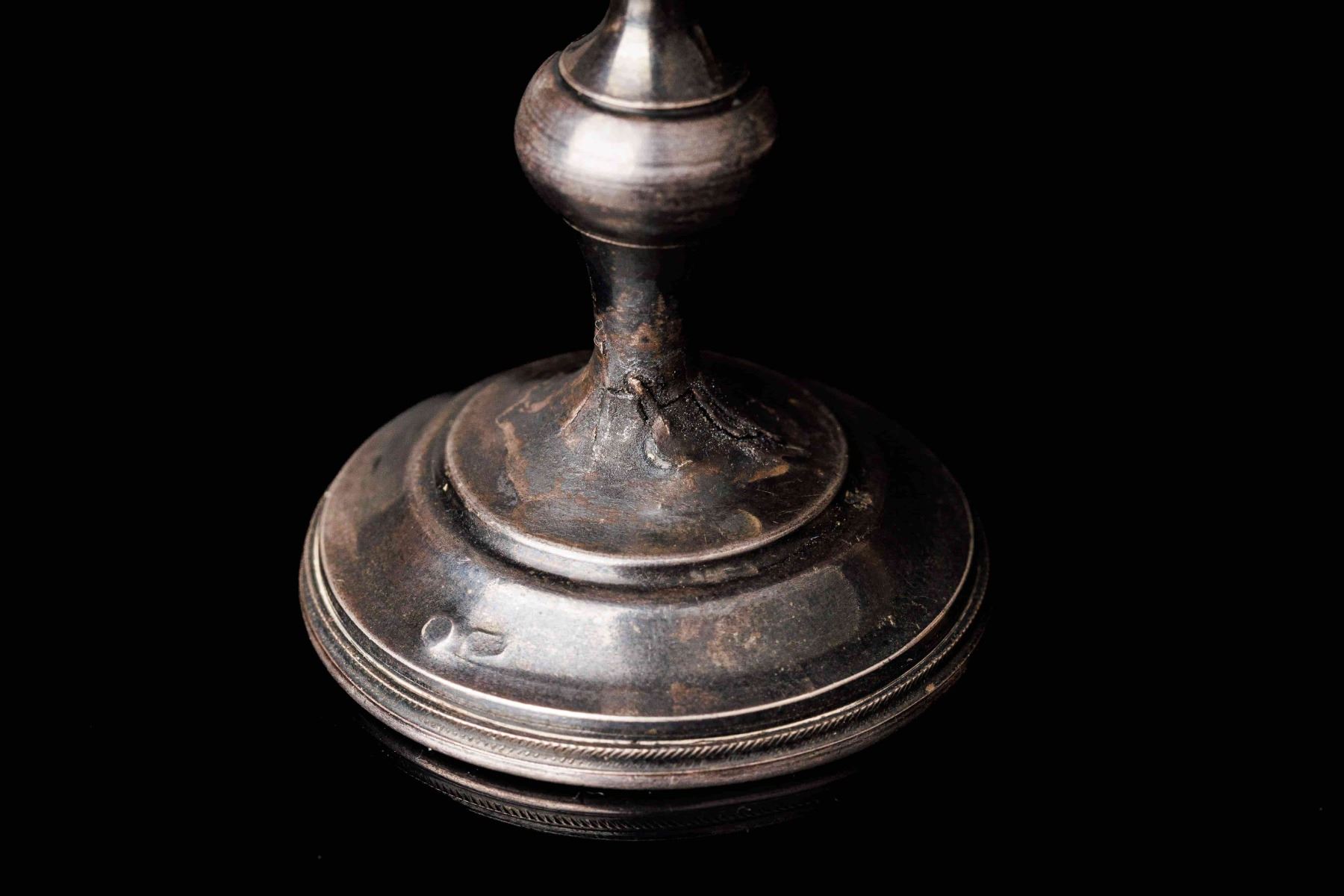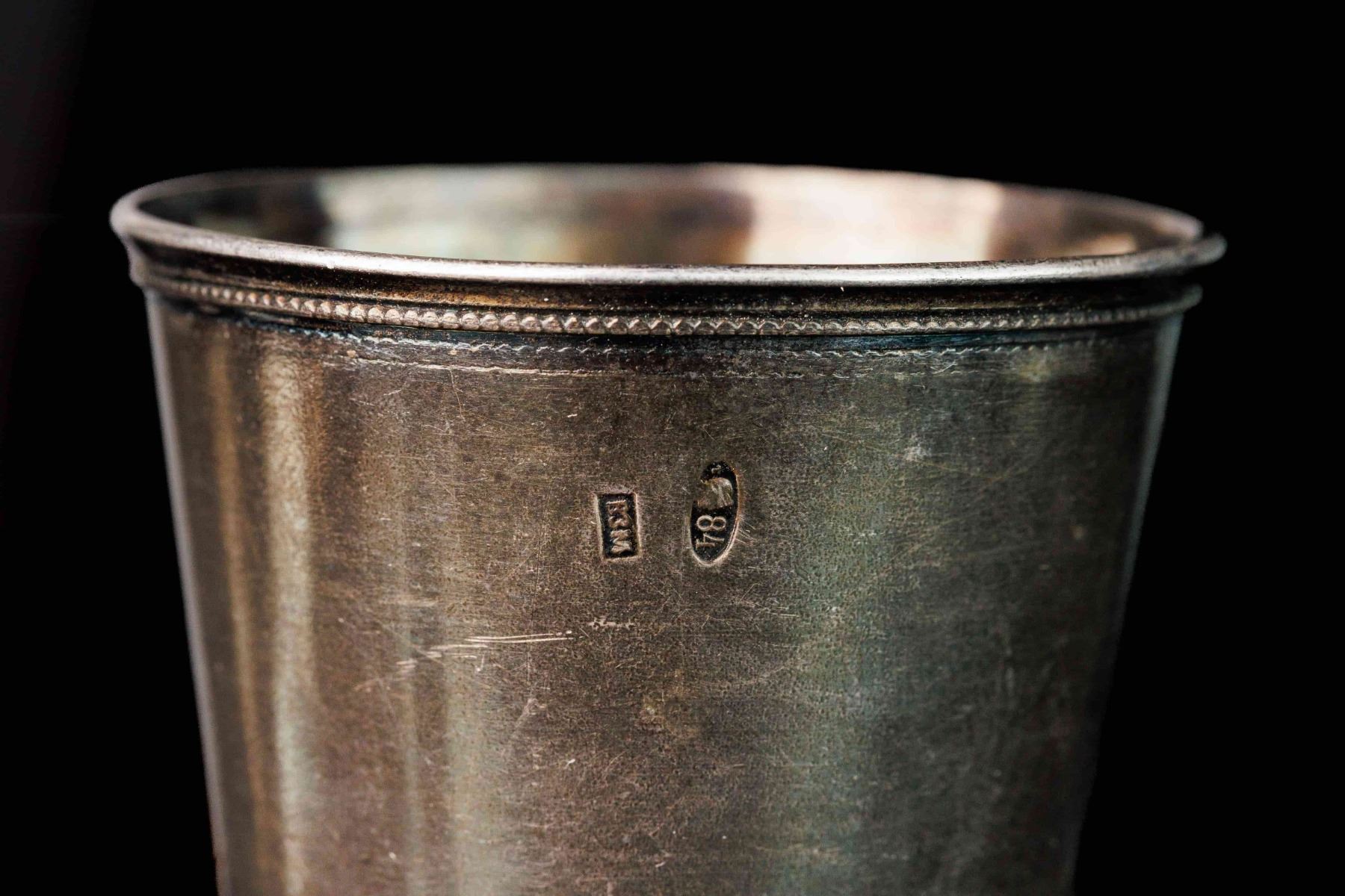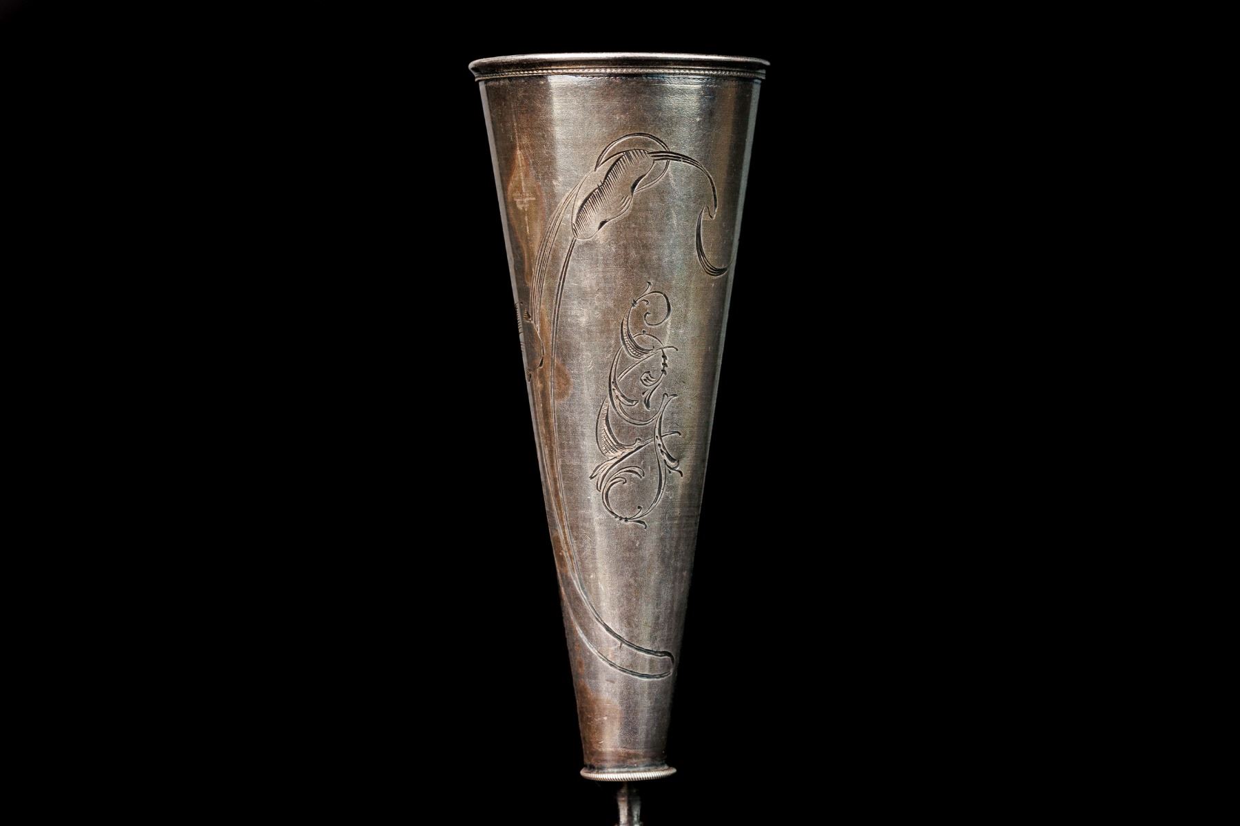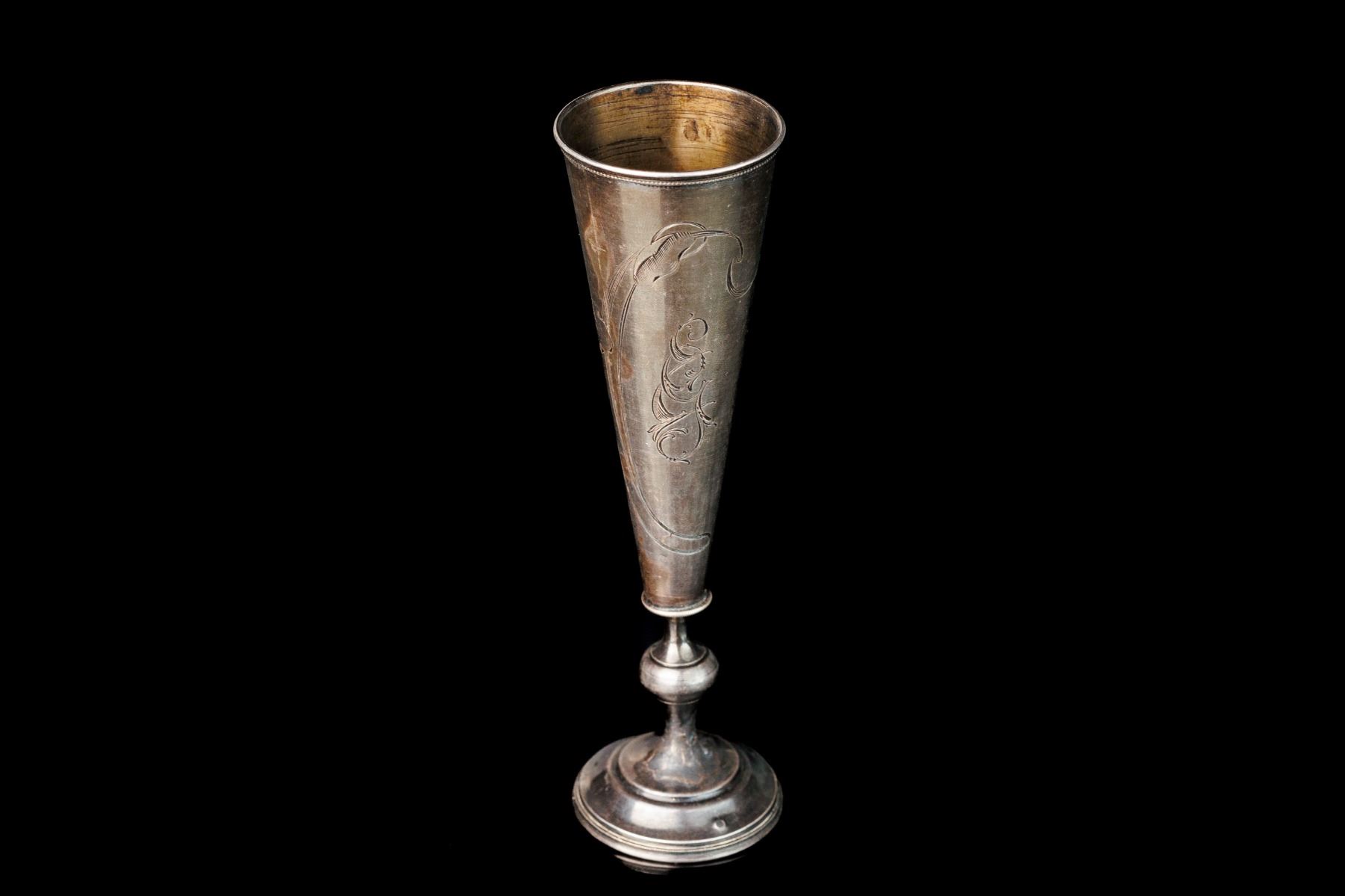 Antique Russian Silver footed rjumka silver 84. Beautiful chiseled decoration. Art Nouveau style. Kostroma. Manufacturer mark VZM. There are cracks on the base. Height 15,8 cm and weight 55 gr.
