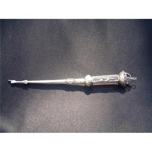 Rare Russian silver Torah pointer (Yad) dated 1879 with maker initials AK. It is marked with 84 imperial mark and another mark that is not distinct. The apical portion is decorated with filigree-like decorations. Dimensions: 12.2" (31 cm.). Estimated value: $1500.