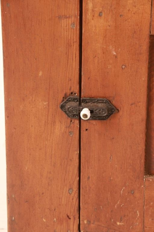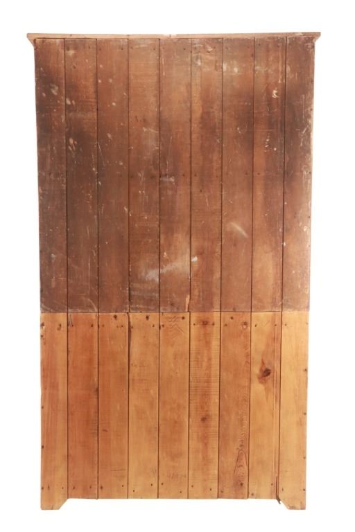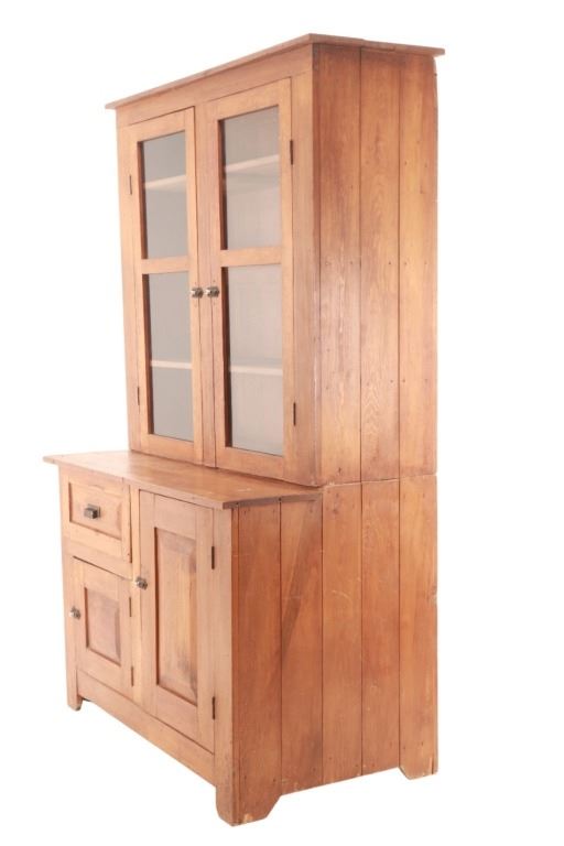 For your considerration is an Antique Pine Flat-Wall Rustic Step-Back Cupboard, circa late 19th to early 20th century. The American Farmhouse design hutch cabinet, also commonly referred to as a china cabinet or a step-back cupboard, is made of solid wood. Cupboard is a two-part form with an upper display section that is set back from the lower base, creating a narrow counter area. It features glass-paneled doors, ideal for displaying dishware or collectibles. The interior shelves are visible, and the top has a simple, straight cornice molding. The lower section provides concealed storage with solid wood panel doors and a central drawer, suitable for keeping items like silverware or linens out of sight. It also includes an open storage space with a pull-out wooden bin, possibly for items like flour or potatoes in a kitchen setting. Simple, traditional hardware, includes small knobs on the drawer and latches on the doors, ornate escutcheons and pull. The step-back hutch is in very nicely preserved condition, wood displays rich patina throughout. Assembled measurement is 29.25"D x 49.5"W x 82"H, upper section weight is , lower section weight is