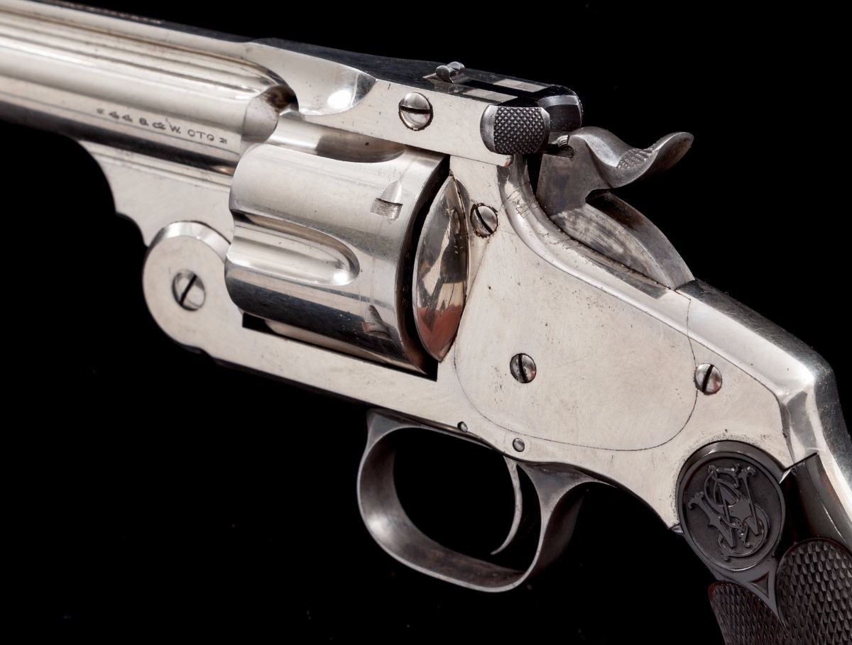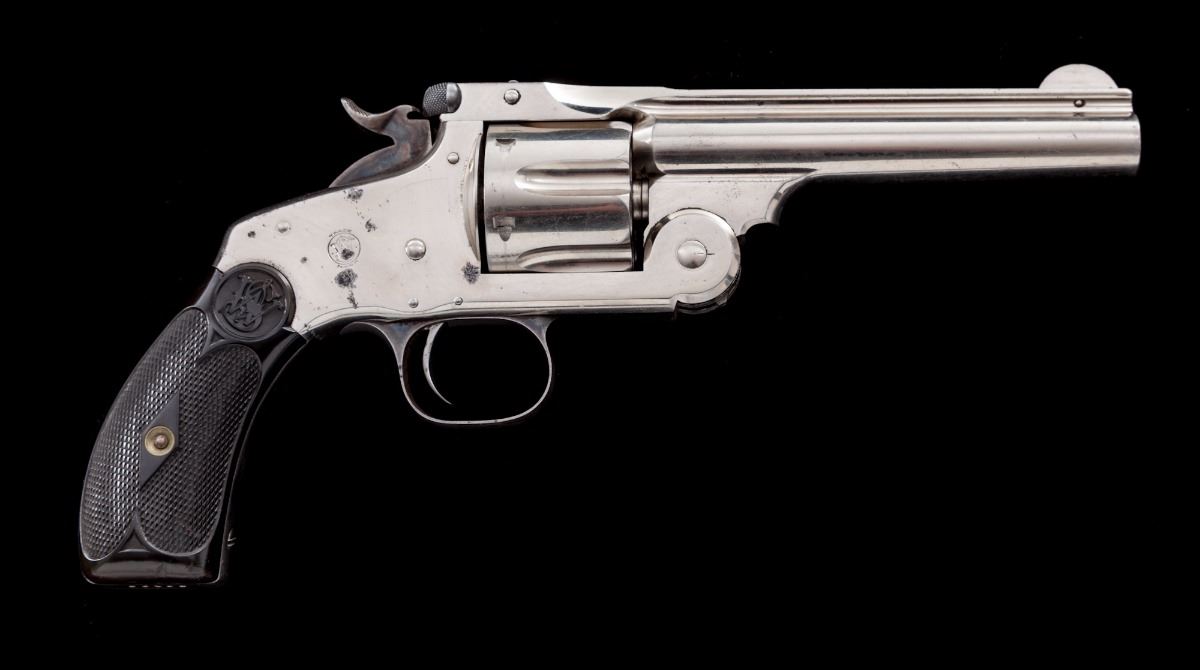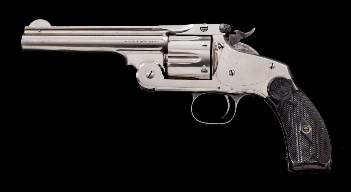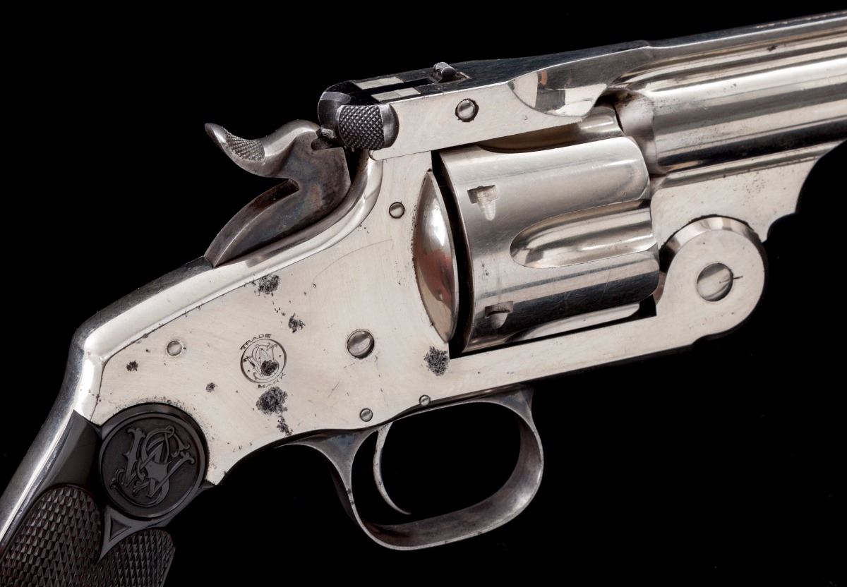 Antique Smith & Wesson New Model No. 3 Single Action Revolver, #35103, .44 S& W Russ. cal., 5'' barrel, nickel finish, factory checkered hard rubber grips. Shipped 1912. Condition is very good to near fine retaining approx. 85%-90% original nickel, with thinning, light scratching and clouding to finish. Right side with several spots of light pitting behind cylinder near trademark logo. Matching numbered cylinder and latch. Grips and action are crisp, bore is bright. Est.: $1,000-$1,500. (Antique)
