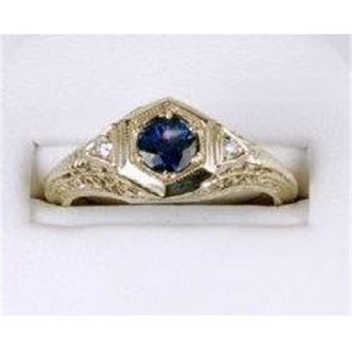 This Antique Filigree ring from my collection features a Blue Sapphire with a Diamond each side. The color of the Sapphire is just beautiful - it is not too dark, not too light - just a lovely Royal Blue.Antique 14k White Gold ring with a round Sapphire = .45 CARATS and a Diamond each side. The Diamond Total Weight = .06 CTS. This ring is a Size 6 3/4 and I can easily resize it for you either larger or smaller.