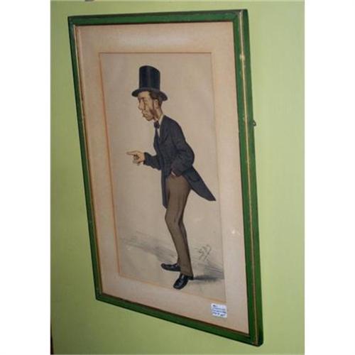 From 1864 to 1914 the English Vanity Fair weekly magazine featured a full page caricature of a person of prominence at that time. Most of the prints were colored by chromo-lithography, an arduous method of Victorian printing using several limestone blocks. They were offered as collectors items to encourage sales of the magazine and have since become highly sought after by collectors and non collectors alike. Among the subjects are sportsmen, lawyers/judges, artists, actors, explorers and politicians, to name a few, many of whom became famous historical figures. Framed in a green and gilt frame, some toning present.