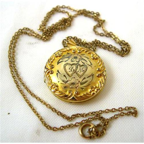 A wonderful 7/8" across vintage 1940's gold filled etched sweetheart locket with 10k gold filled 20" long from end to end chain in very good condition. The initials "KM" or "RM" are engraved on the front, and the inside still holds an old photo. Add this great locket to your old jewellery collection!