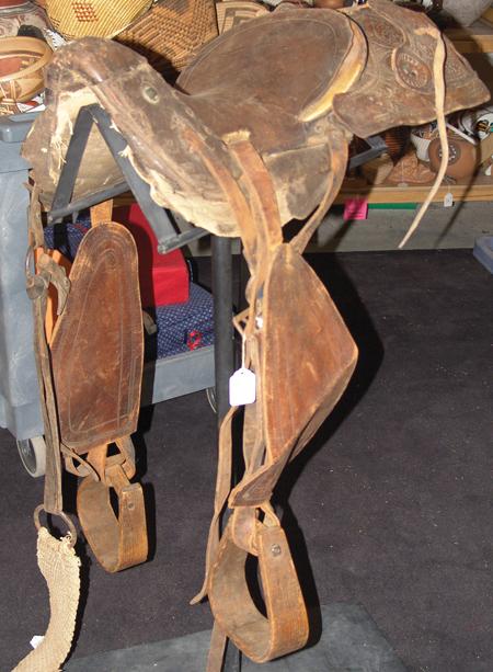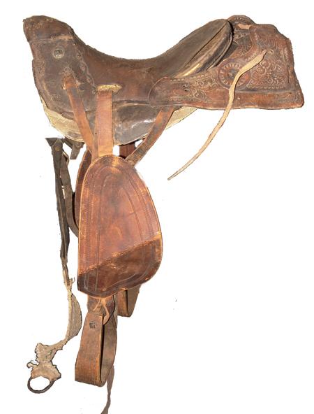 Old hornless saddle with hand tooled leather features. 10" seat.