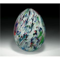 Antique Saint Louis hollow scrambled millefiori egg-shaped handcooler, with swirled sections of colorful twists of white, blue, red, and green. Height 2 9/16". Diameter 1 7/8". $1000-1400