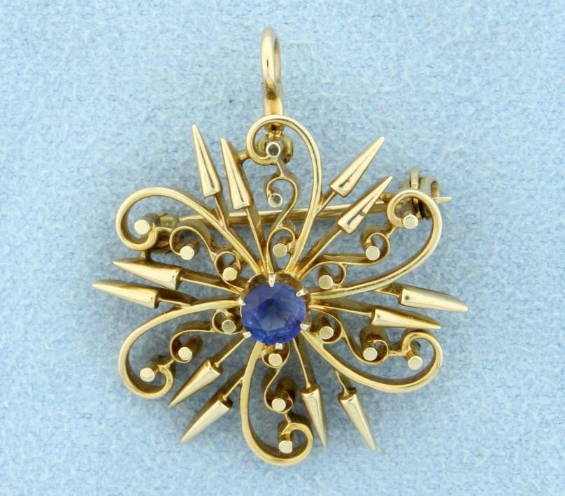This stunning Antique pin/pendant combination is set in 14k yellow gold with a fabulous blue gem color Sapphire at the center. This Gem Sapphire is 4.5mm in diameter and totals approximately a 1/2 carat! Great look and condition and this Sapphire is still very blue. 6.9g
