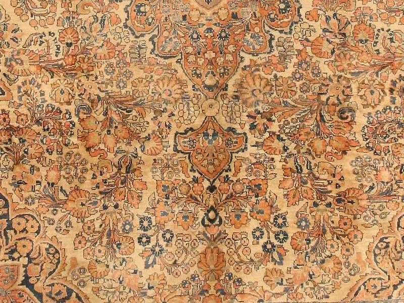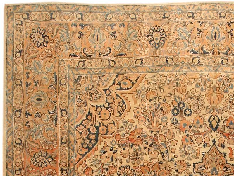 8.10 x 11.07 Circa 1900 Antique Sarouk, Persia - A grand medallion design spreads lushly across the field of this luxuriant antique Sarouk. A dense tangle flowering vines surrounds the medallion, complemented at the corners by blue ground spandrels. The field elements are all set against an ivory ground, but the pattern is sop closely worked that it appears as little more than a glowing accent among the golden details of the vine and the medallion. The vinescroll continues the design and palette of the field, giving the entire carpet a highly unified decorative aspect. The rich pile enhances the overall impression of lush complexity.
