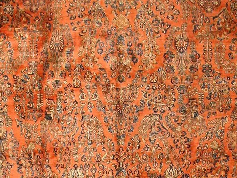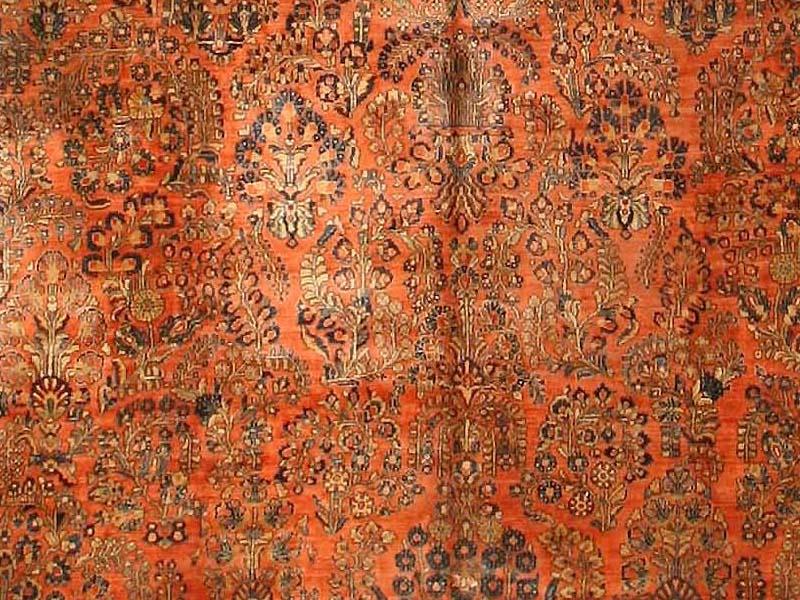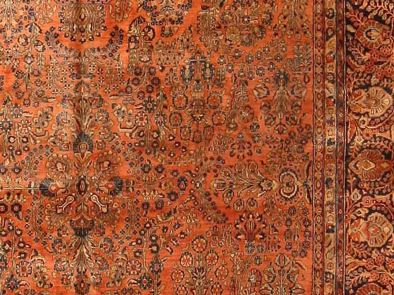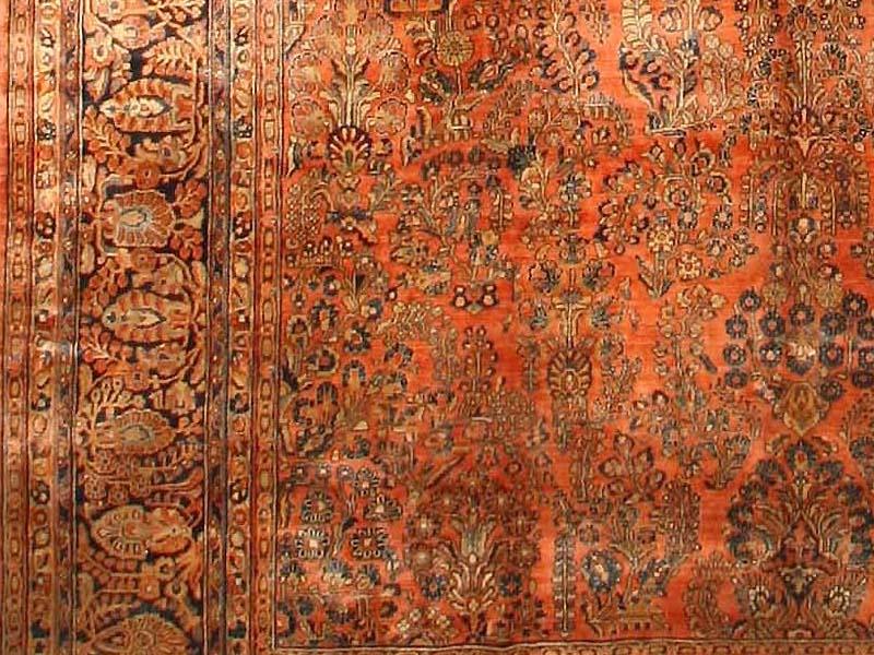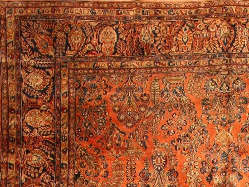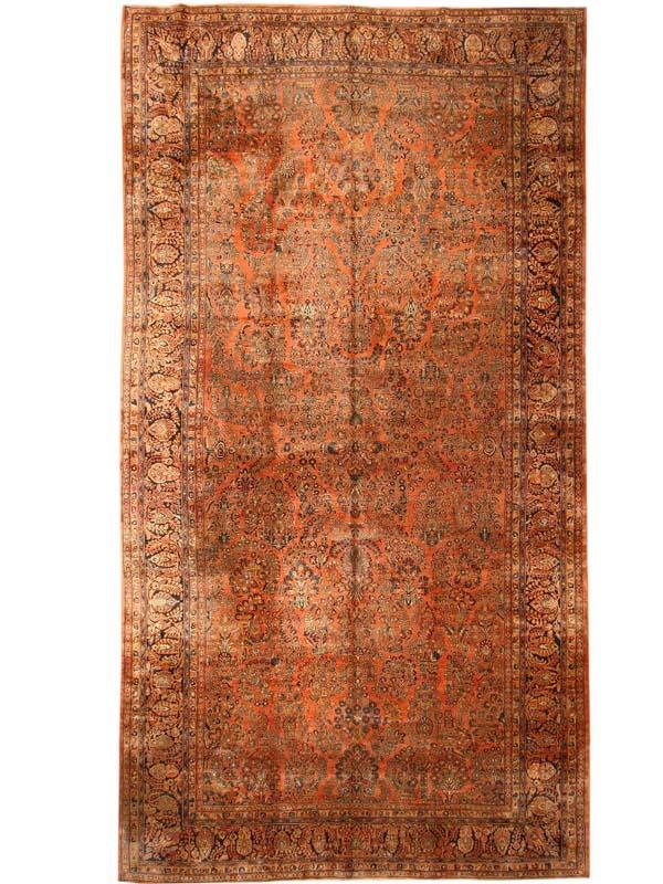 11.02 x 20.05 Early twentieth century Antique Sarouk Rug, Persia- Rich sprays of flowering branches and palmettes repeat in allover symmetry across the soft salmon-gold field of this exuberant antique Sarouk. The same elements are re-arranged to make up the main border, but set against a dark ground for framing contrast, while minor borders offer a transition between the coloration of the field and border. The lush and lustrous pile accentuates the luxurious effects of the design and color.