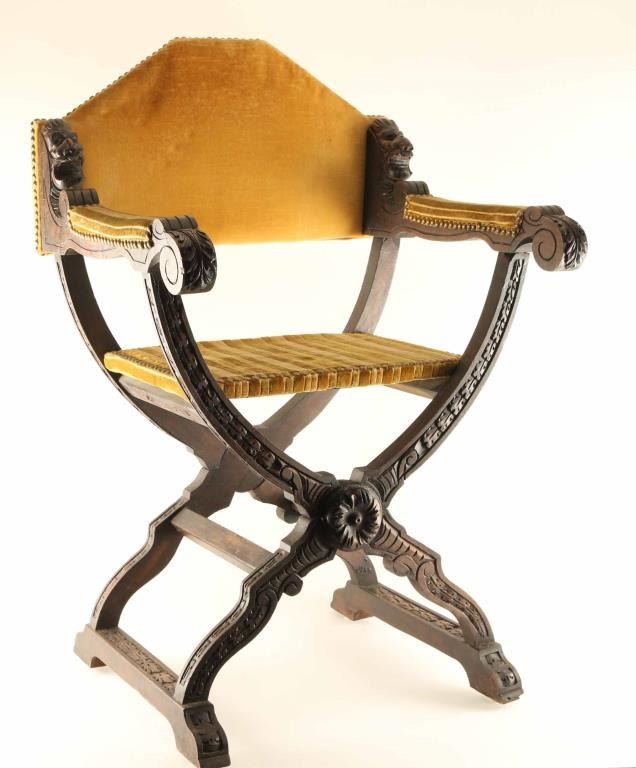 Finely carved dark wood chair with floral and leaf accents throughout. Dragons head accents at the base of each arm by the backrest. Seat and back have been covered in a gold and gold striped velvet with tack accents. Measures 24"l x 20 1/2"w x 38 1/4"h.