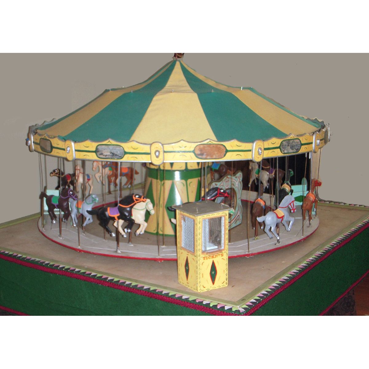 Antique scale replica carousel, 20 horses with 2 gondolas. Philadelphia style traveling carousel of the type miniature created by Harry Denzel in the 1930's. 42" x 42." Fully operational with jumper horses, adjustable rotation speed, and park lighting.