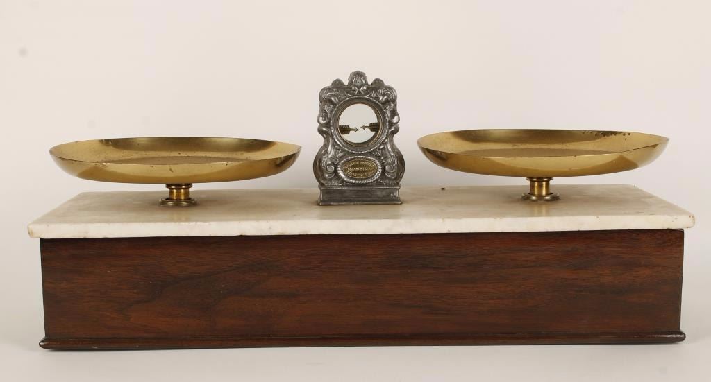 Made by the French company Beranger & Company, Mahogany Base with white marble with brass dishes. In original condition.