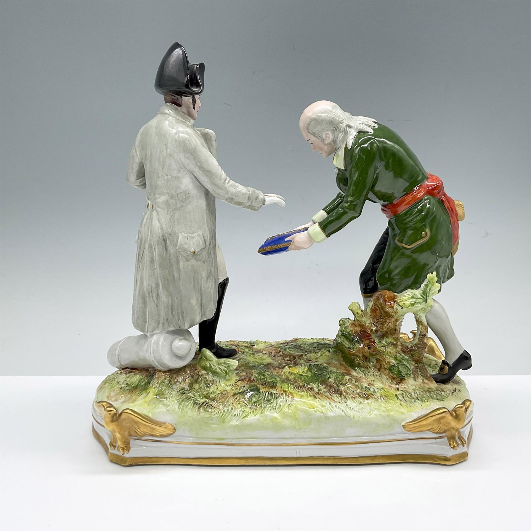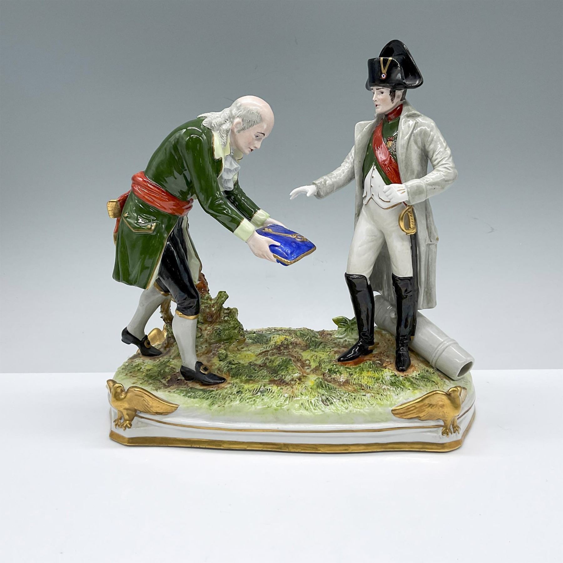 Hand painted and hand modeled figure that depicts the early 19th century historical event of Napoleon Bonaparte receiving the keys of Vienna at the Schloss Schonbrunn. The figure is inspired by Anne-Louis Girodet de Roussy-Trioson (French, 1767-1824) oil painting of the event. Green, gray and gilded colorations.