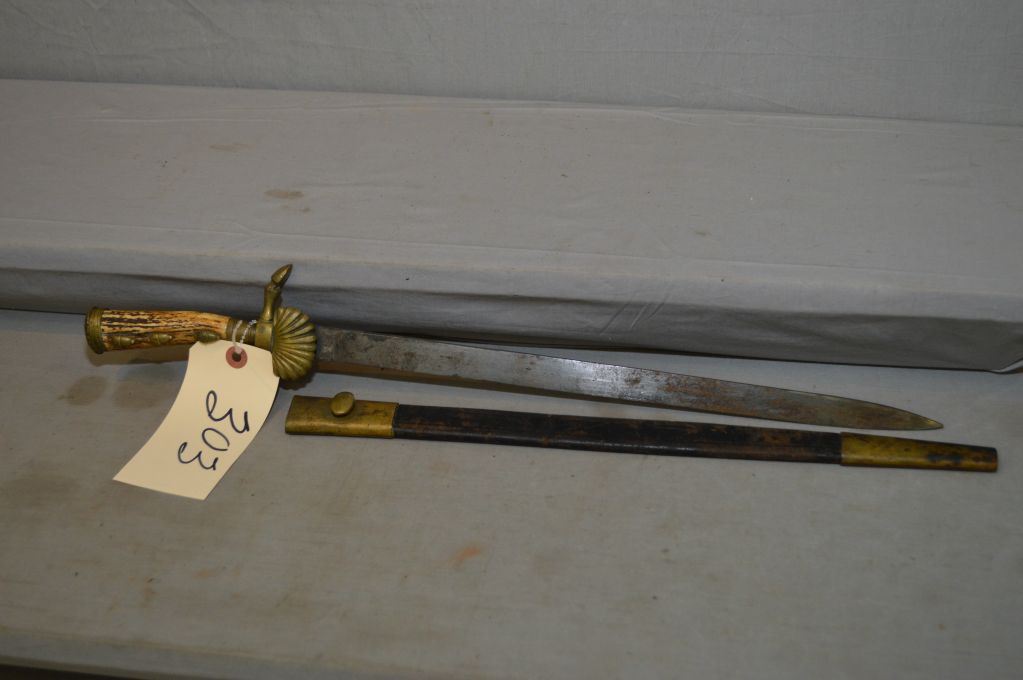 Antique Scottish ? Dagger w/ approx 16" blade [ w/ brass & leather wrapped scabbard, w/ hoof & shell designed fancy hilt, stag horn handled w/brass cap & three brass acorn decoration ]