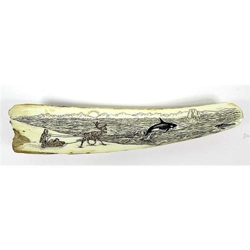 <Our item number 138791><B>Antique Scrimshaw.</B> Length 9 1/4 in. Carved reindeer and sledding scene with orca and seal. <BR>Estimated Value $500 - 600. <BR><BR>Our item number 138791<BR><IMAGES><P ALIGN="CENTER"><IMG SRC="http://www.goldbergcoins.net/liveauction/49jpegs/138791.jpg"> </P></IMAGES>