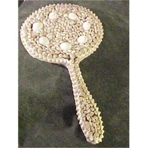 Beautiful Antique Sea Shell Hand Mirror. 13 inches Tall, 7 inches wide , Mirror in very good condition. We believe this to be an older hand mirror that is wood, that was covered with sea shells and lace in a beautiful design.