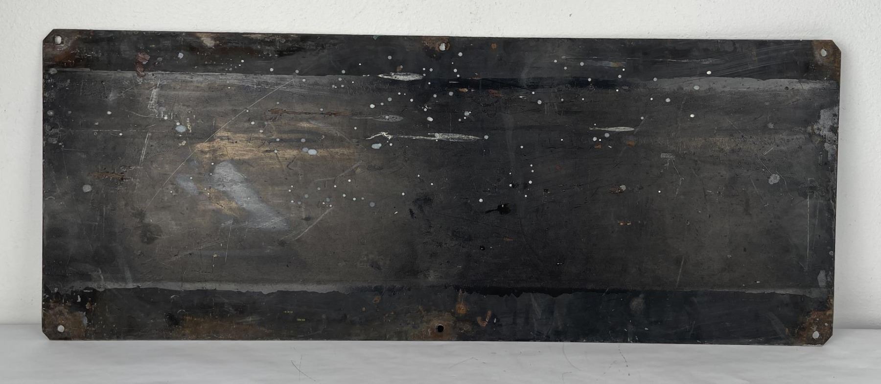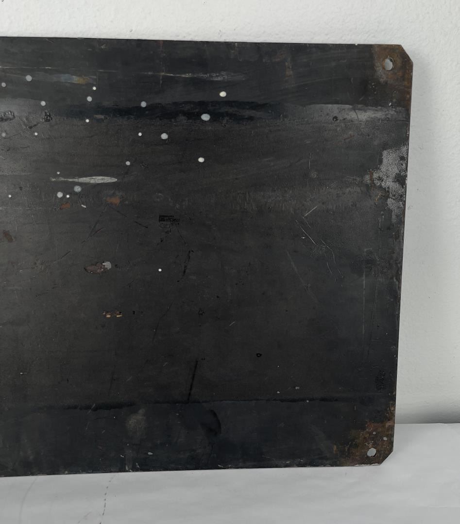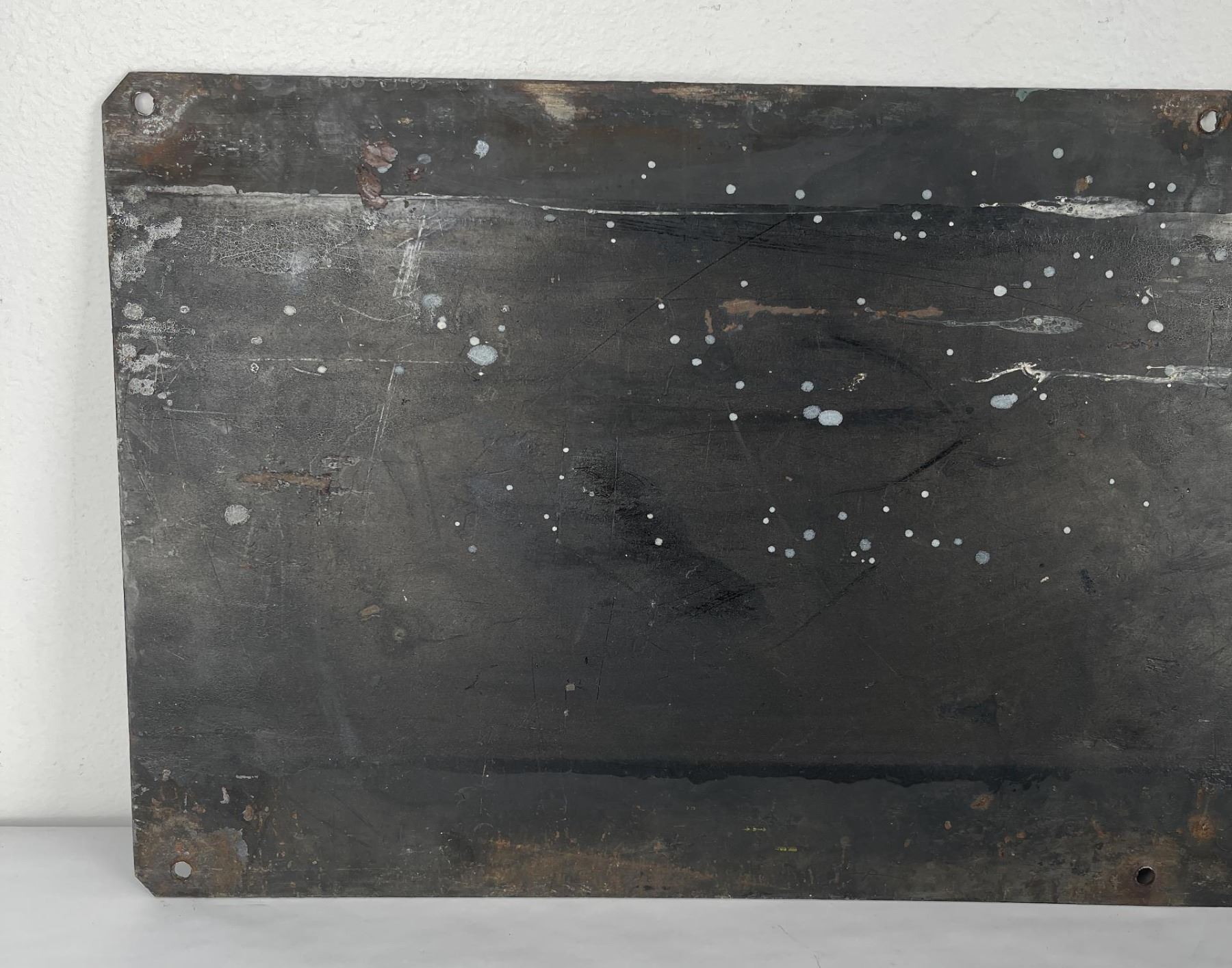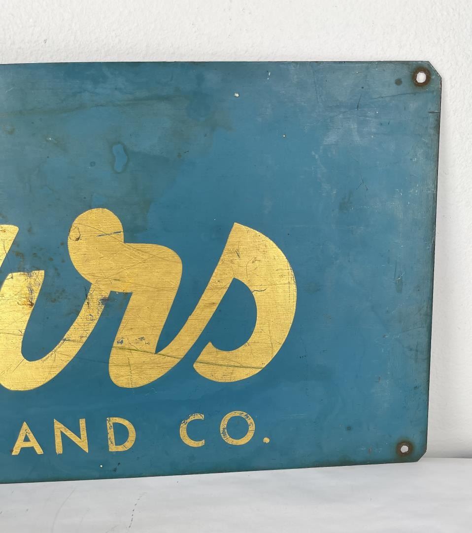Very nice old original sign. Heavy gauge painted metal. Hung in front of the store. 14" by 36".