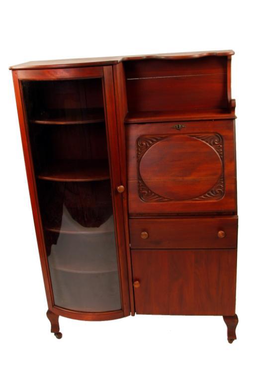 Antique Secretary/Bow Front Curio Cabinet on casters, in overall fair condition.