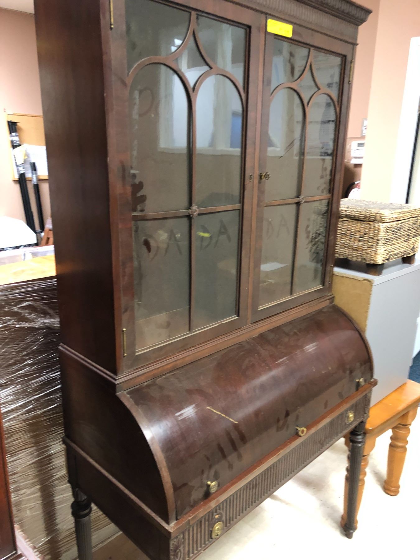 Antique Secretary - Glass Display and roll up desk to display cubby holes. Comes with keys.